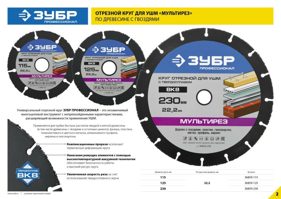 Ниже Вы можете прочитать отзывы на ЗУБР Отрезной круг "мультирез" для УШМ, 230х22,2мм, ЗУБР, ( 36859-230 ), ознакомится с подробными характеристиками, посмотреть интересные обзоры и фотографии на ЗУБР Отрезной круг "мультирез" для УШМ, 230х22,2мм, ЗУБР, ( 36859-230 ).