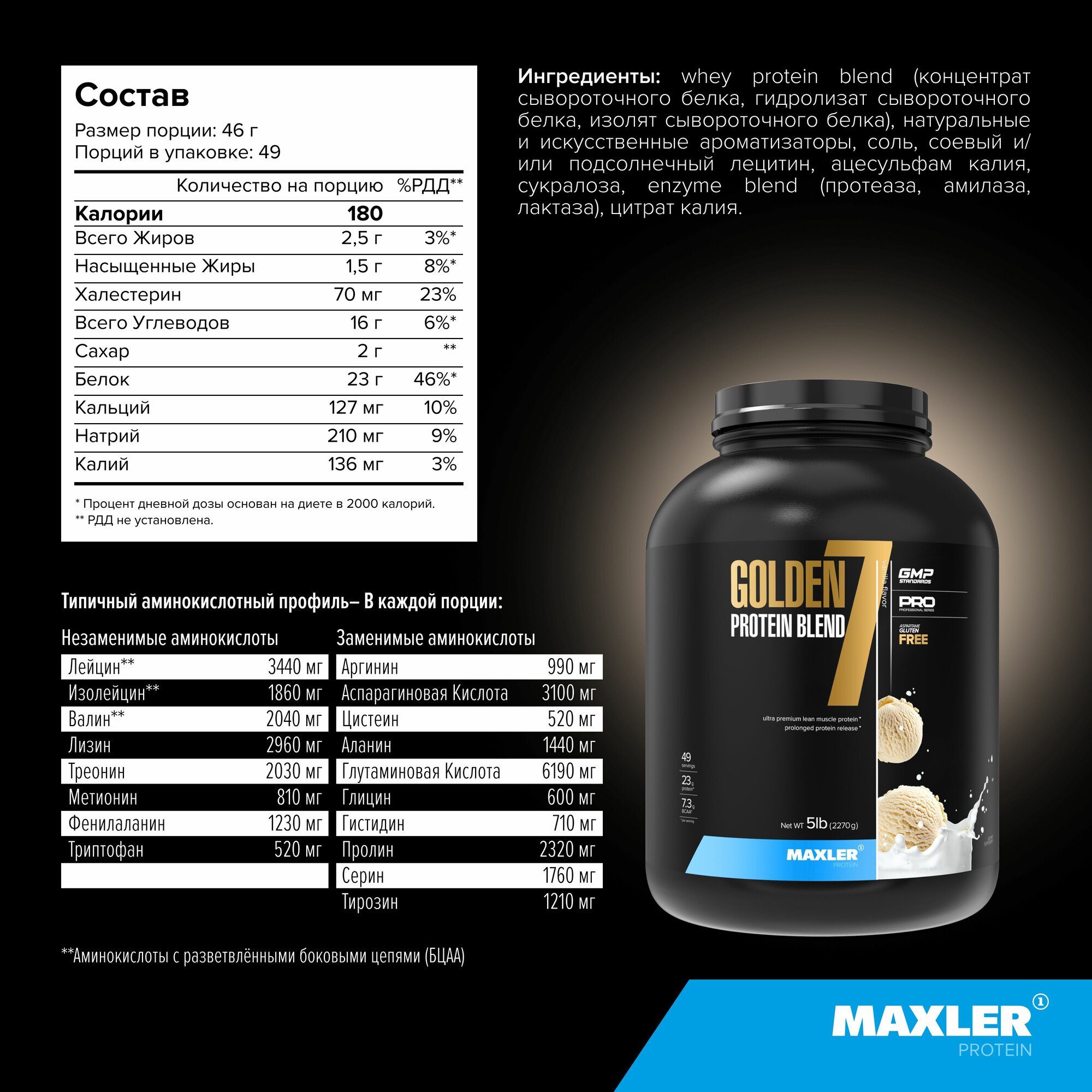 MAXLER USA Golden 7 Protein Blend 5lb Большая банка (Vanilla Flavor)