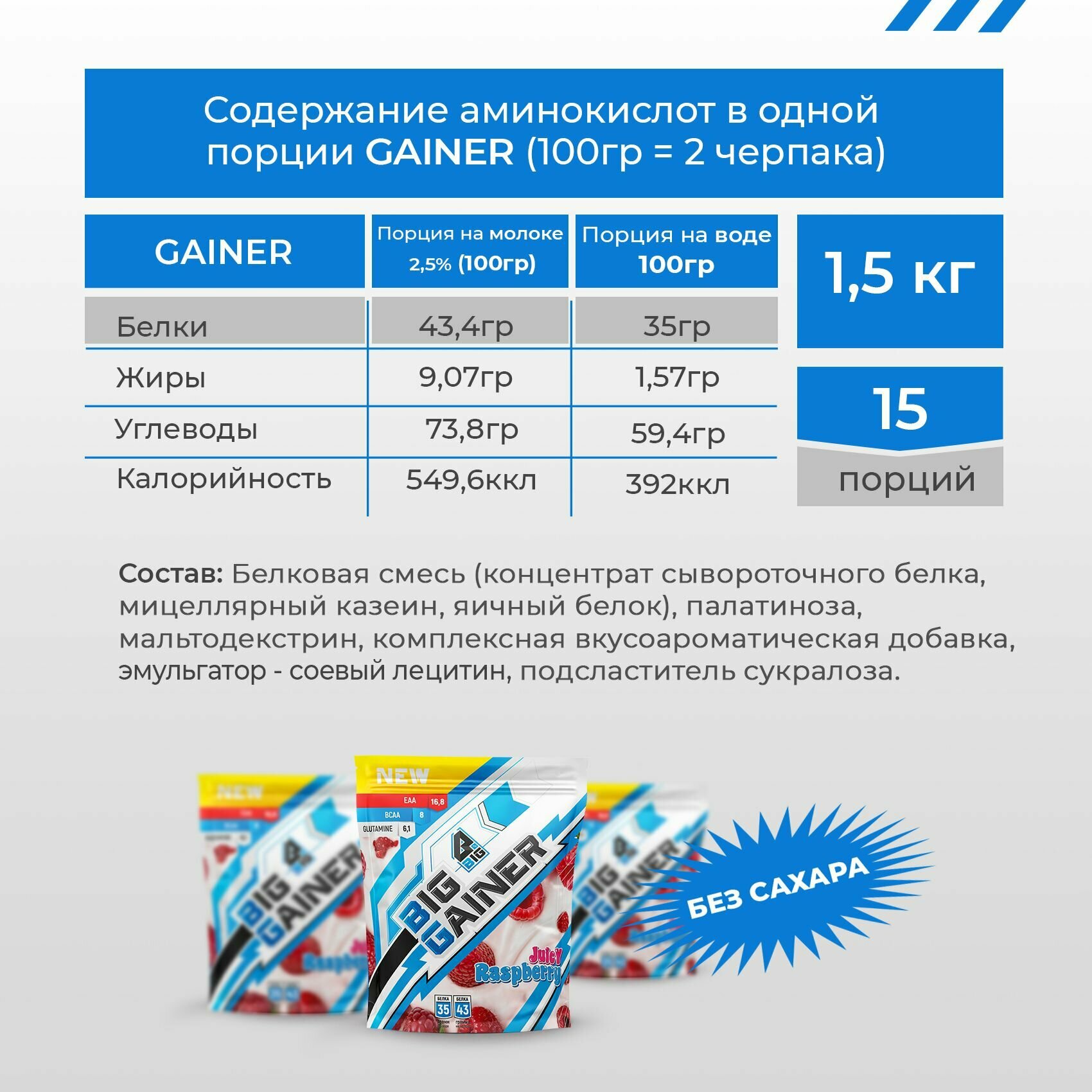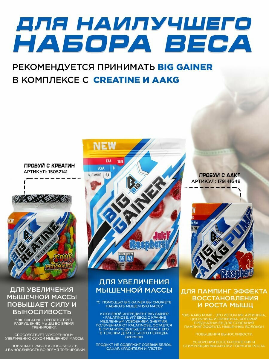 Гейнер BIGSNT BIG GAINER для набора мышечной массы высокобелковый, со вкусом малины / спортивное питание, 1.5 кг