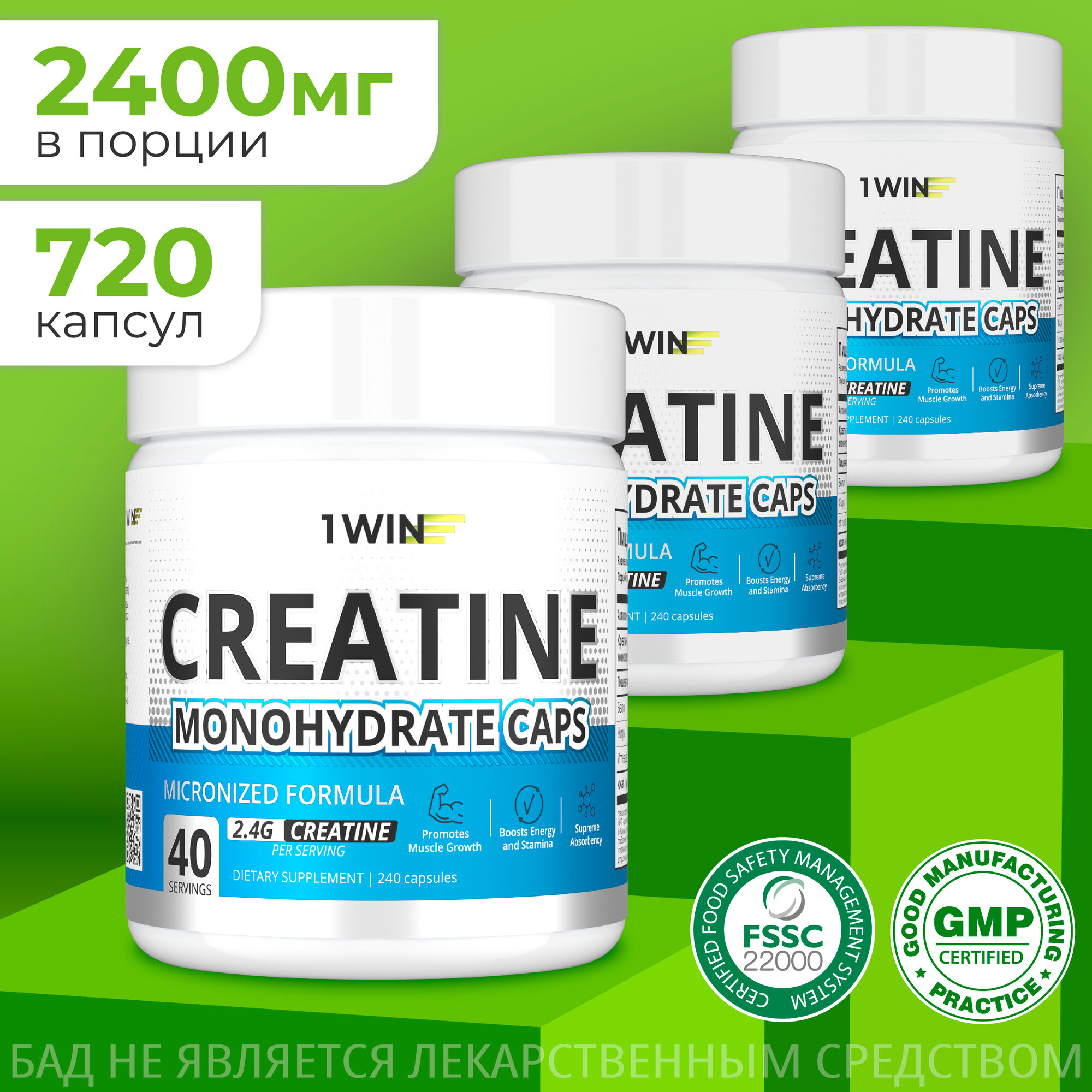 Набор креатинов из 3-шт 1WIN Креатин моногидрат, Creatine Monohydrate, спортивное питание для набора массы тела, 240 капсул