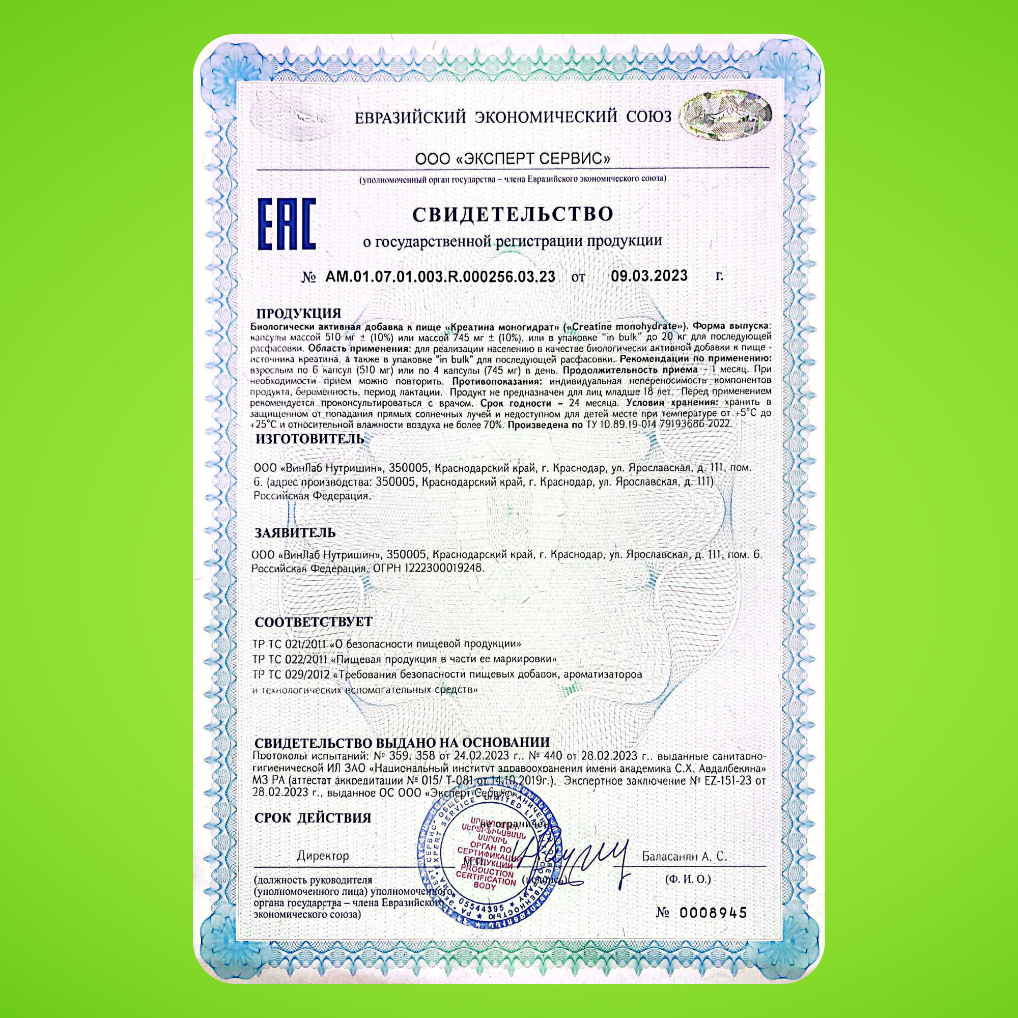 | Форма креатина | креатин моногидрат |