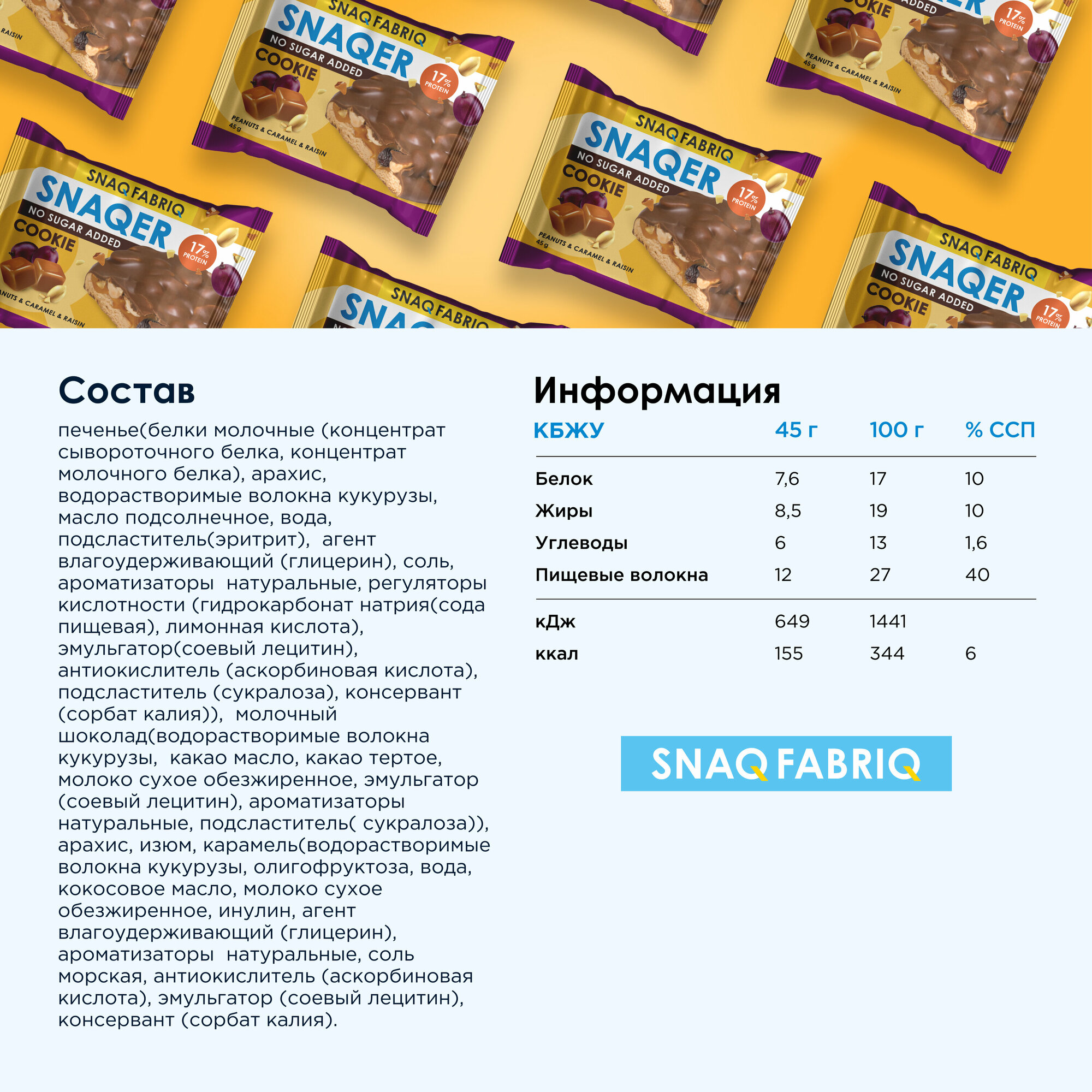 SNAQ FABRIQ Протеиновое печенье в шоколаде SNAQER "Арахис, изюм и карамель", 10 шт х 45 г интересное: