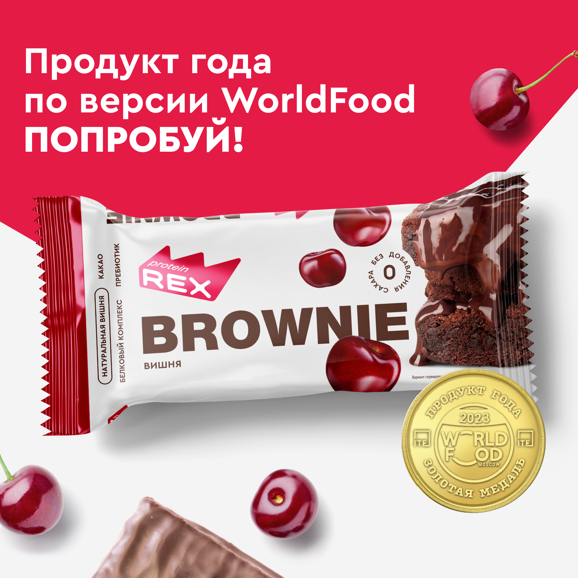 Протеиновое печенье без сахара Брауни ProteinRex Вишня 12 шт х 50 г, батончики, пирожное, десерты, ПП сладости для похудения