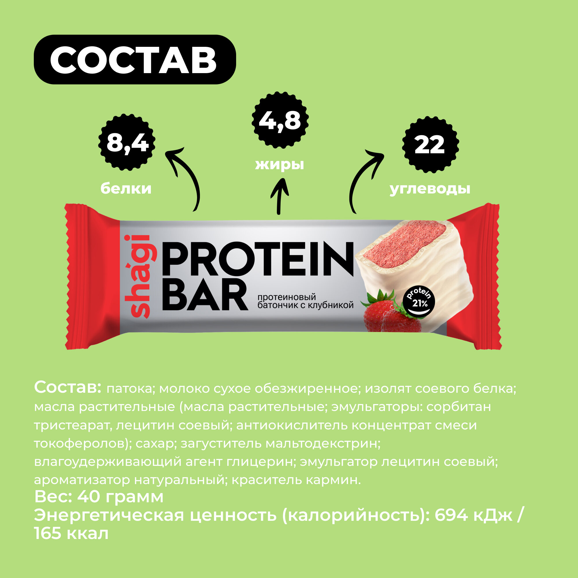 Батончик протеиновый Shagi Клубника, 40 гр х 18 шт, спортпит, пп, полезные сладости, спорт, десерты