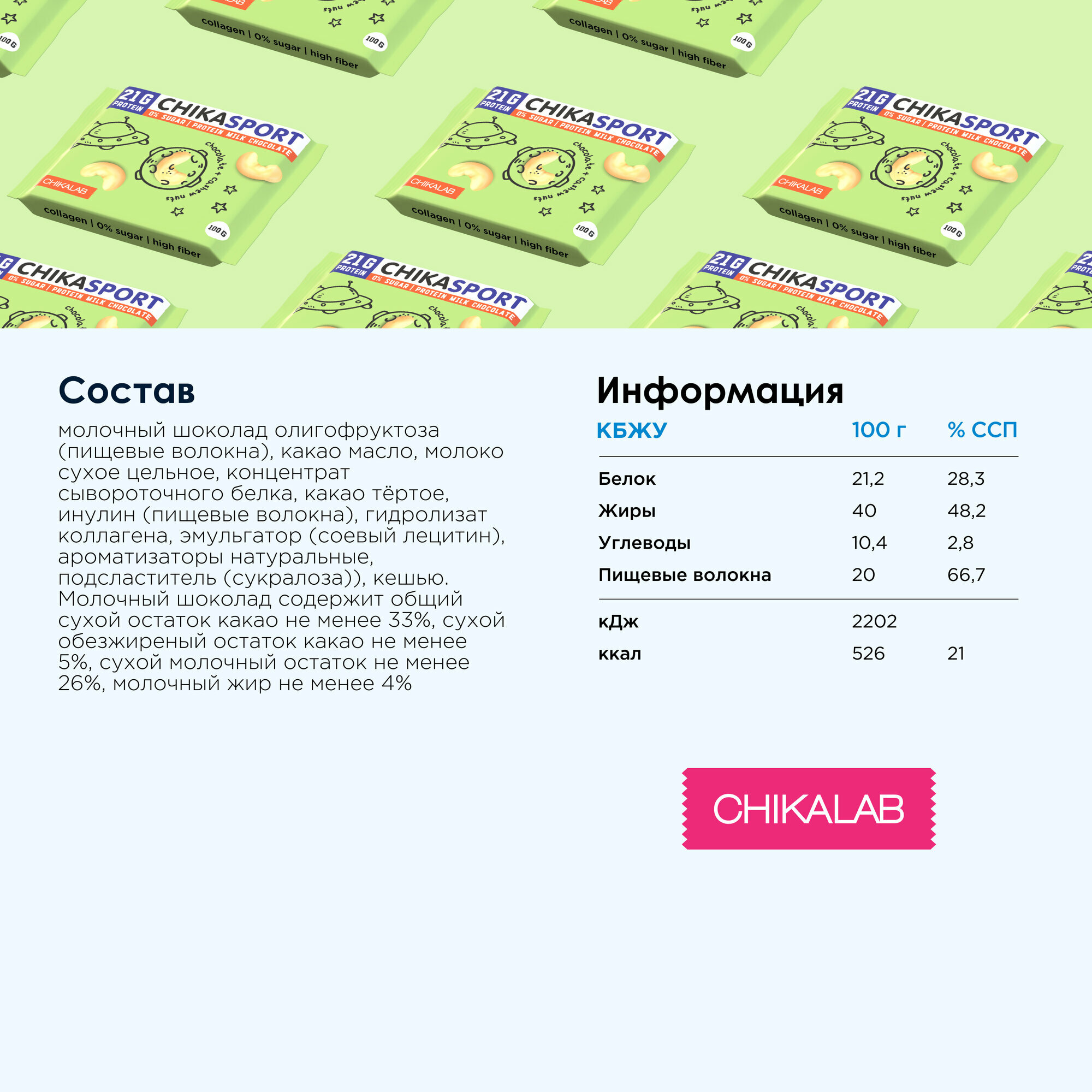 Протеиновый шоколад без сахара CHIKALAB ChikaSport Молочный с кешью (12шт по 100г)