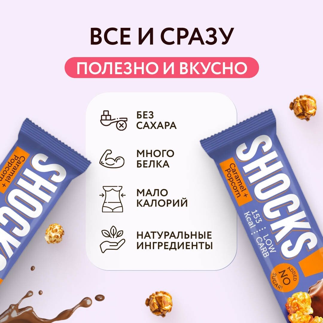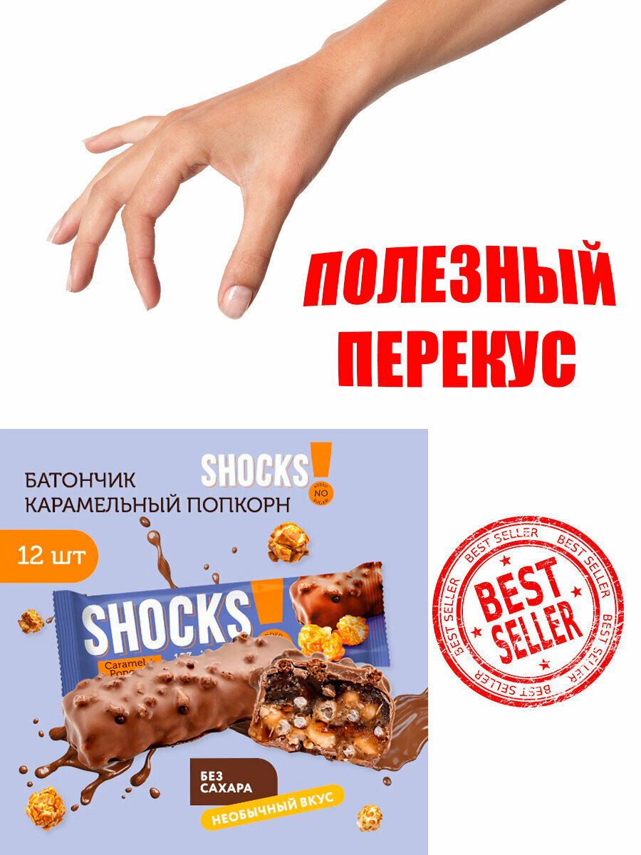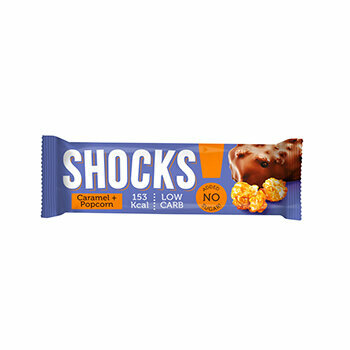 СохранитьБатончики без сахара, 12 шт по 35 гр, SHOCKS батончик глазированный FitnesSHOCK, вкус: карамельный попкорн интересное: