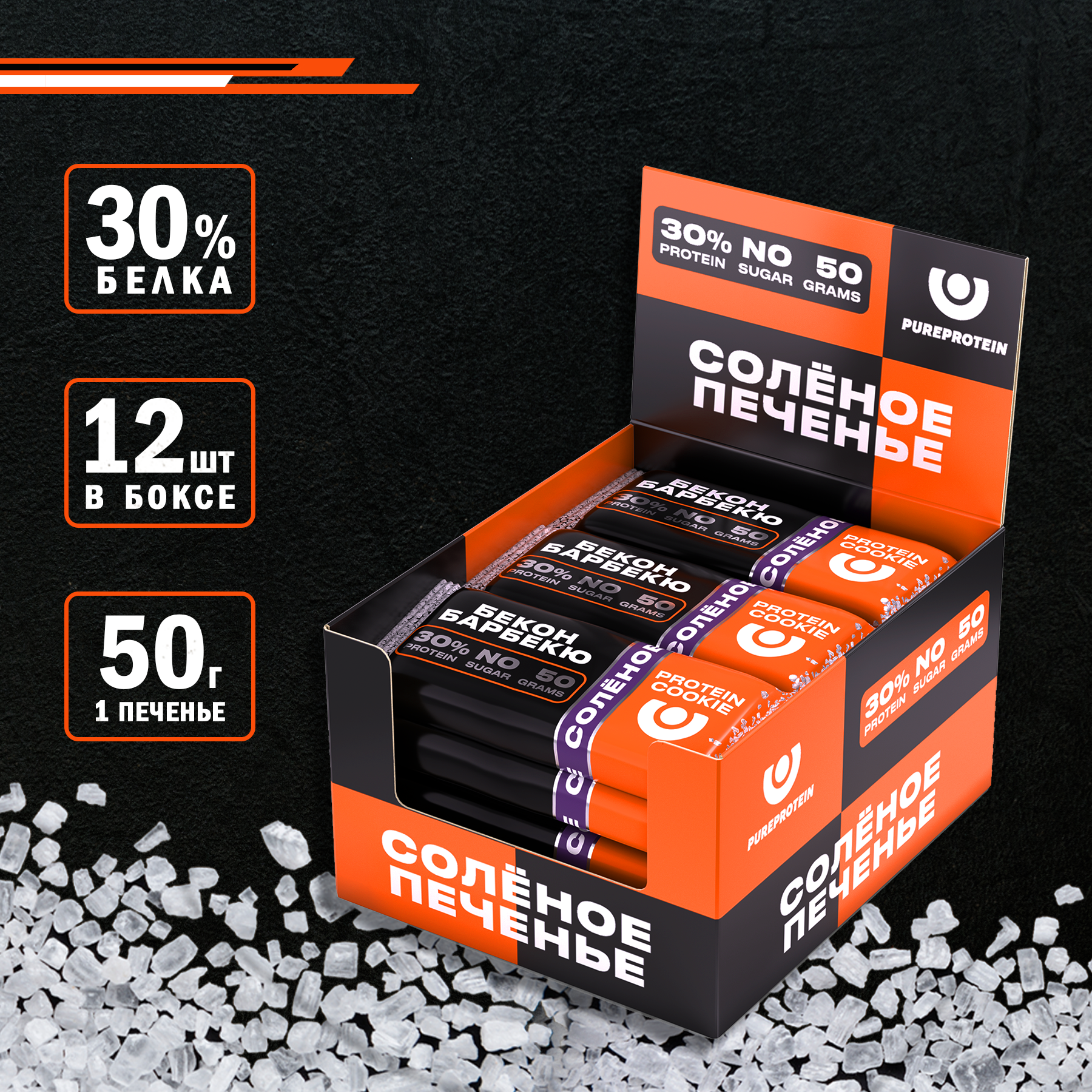 Протеиновое печенье Pureprotein Salty Protein Cookie соленое с высоким содержанием белка ассорти со вкусами Арахис, Бекон и Пармезан 12шт*50г