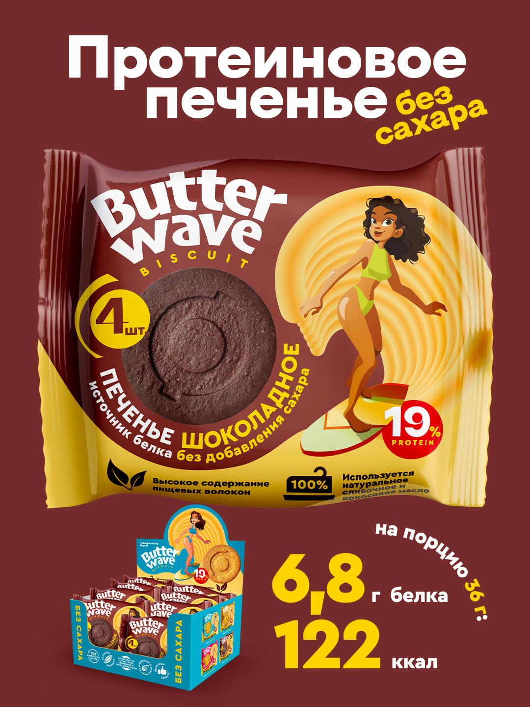 Протеиновое печенье без сахара "Butter Wave" Шоколадное , коробка 32штуки (8 уп по 4шт)