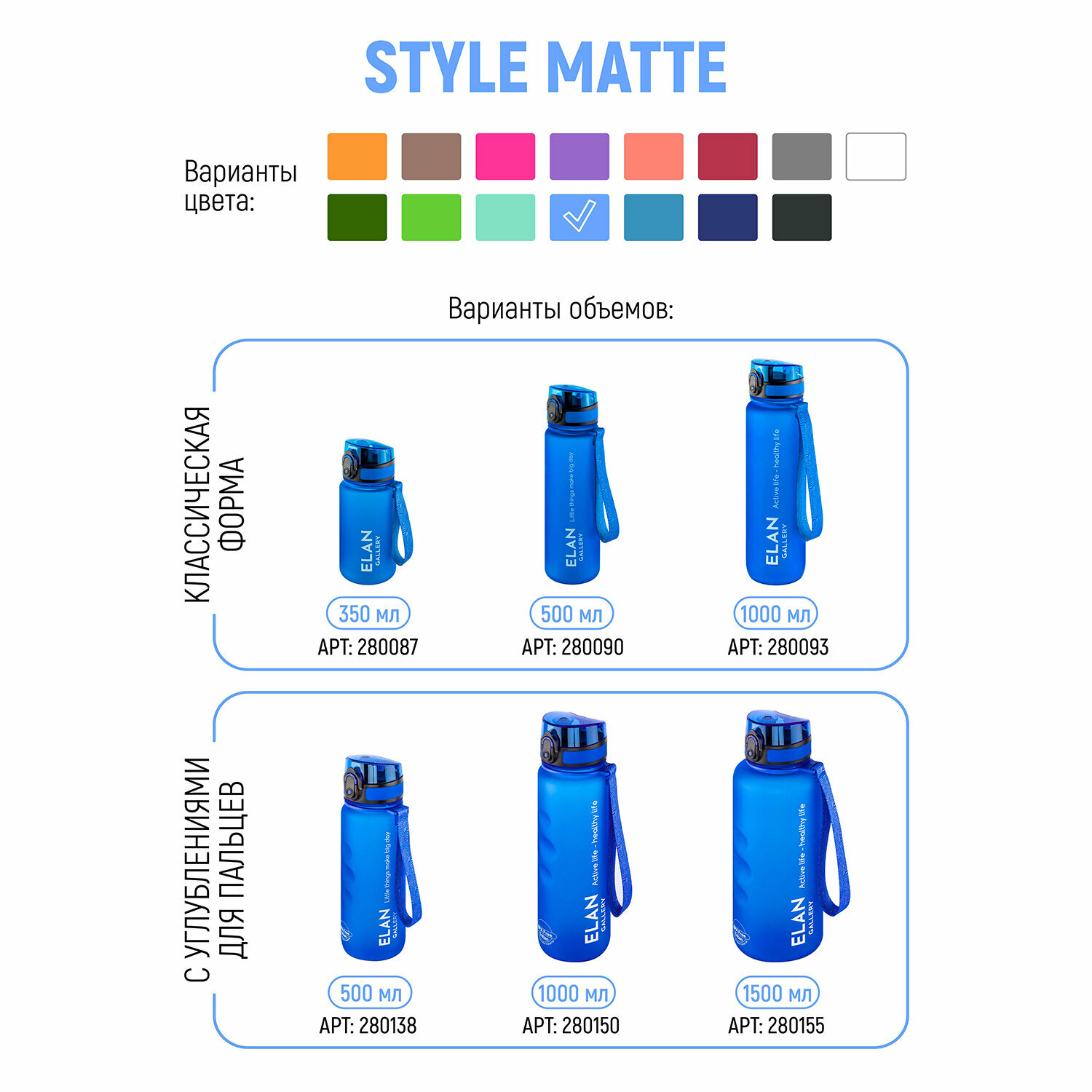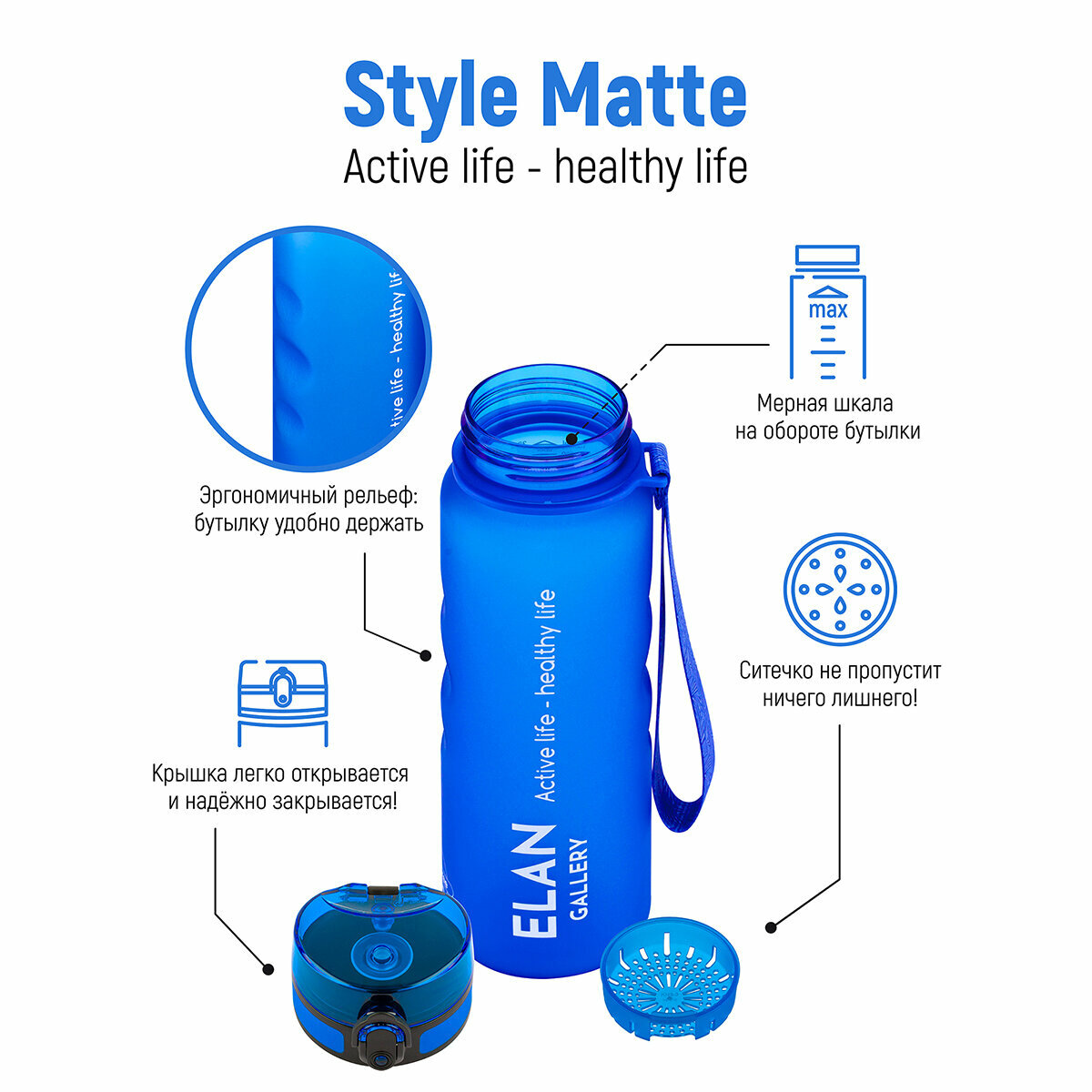 Бутылка для воды Elan Gallery Style Matte, с углублениями для пальцев, небесная, 1000 мл