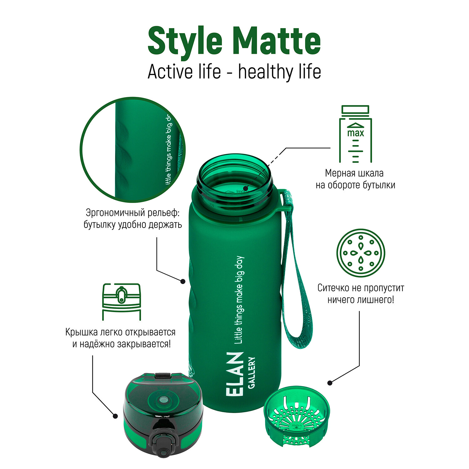 Бутылка для воды Elan Gallery Style Matte, с углублениями для пальцев, темно-зеленая, 500 мл