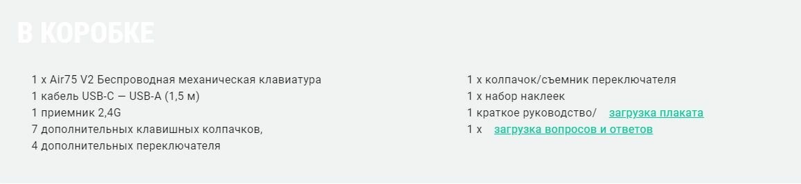 | Комплектация | USB-приемник, двойной пуллер, документация, дополнительные кейкапы, дополнительные переключатели, кабель USB Type-C |