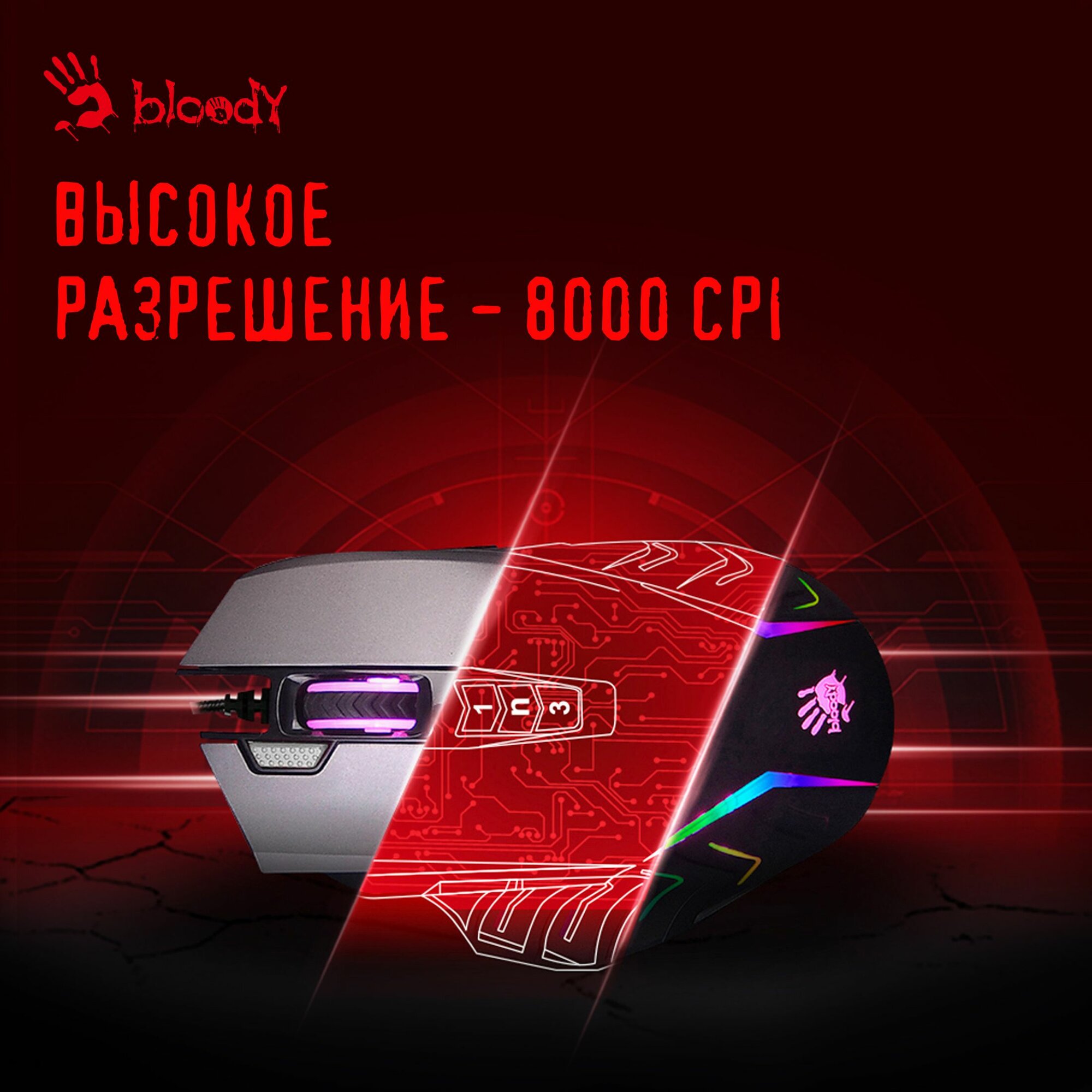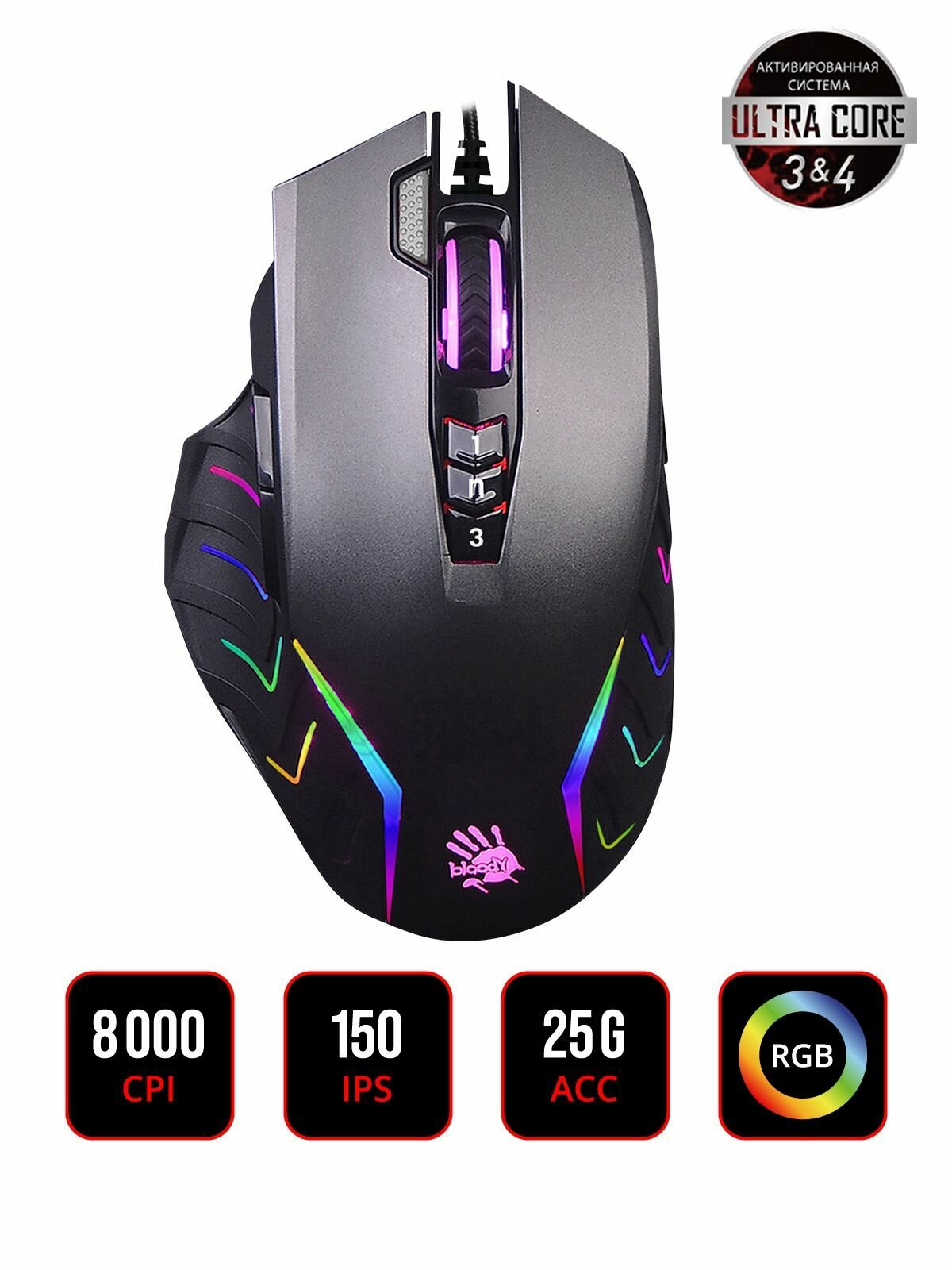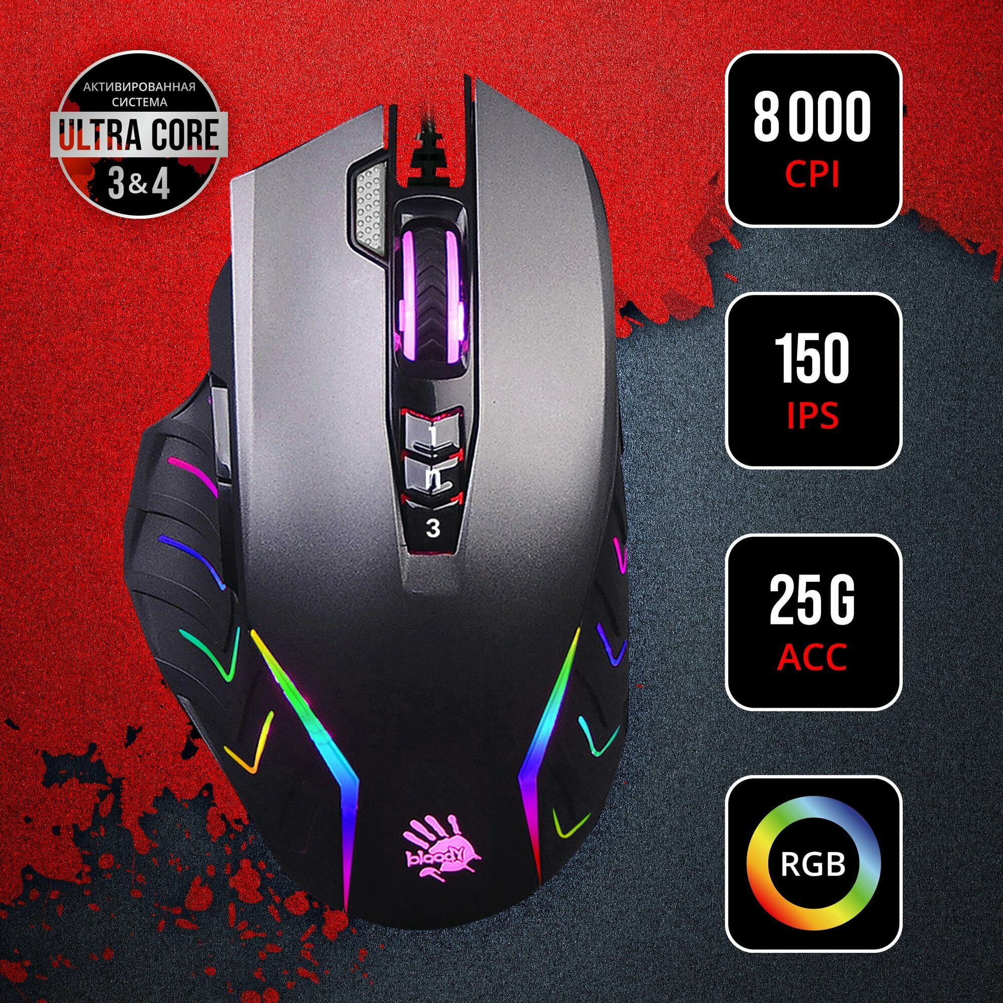 Мышь A4Tech Bloody J95s черный, оптическая, разрешение сенсора 8000dpi, проводная, длина провода 1.8м, кнопок: 9, подходит для правой руки (J95S STONE BLACK ACTIVATED)