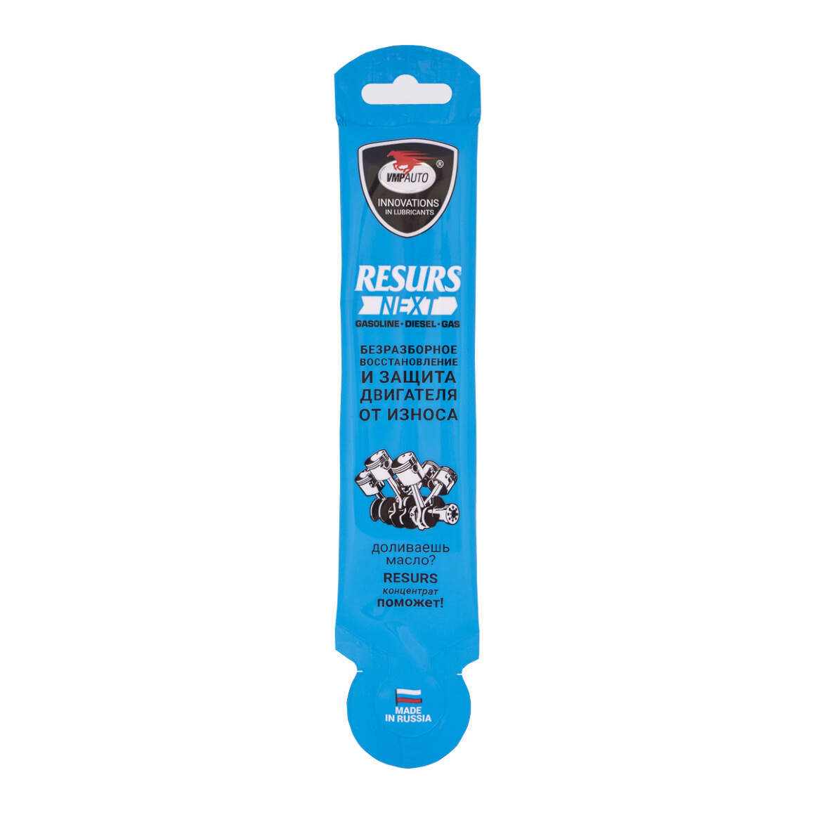 | Способ применения | прогрейте и заглушите двигатель; смешайте 150-200 мл чистого масла с содержимым пакета RESURS Next; залейте смесь в маслозаливную горловину; начните движение; эффект проявится через 150 км пробега |
