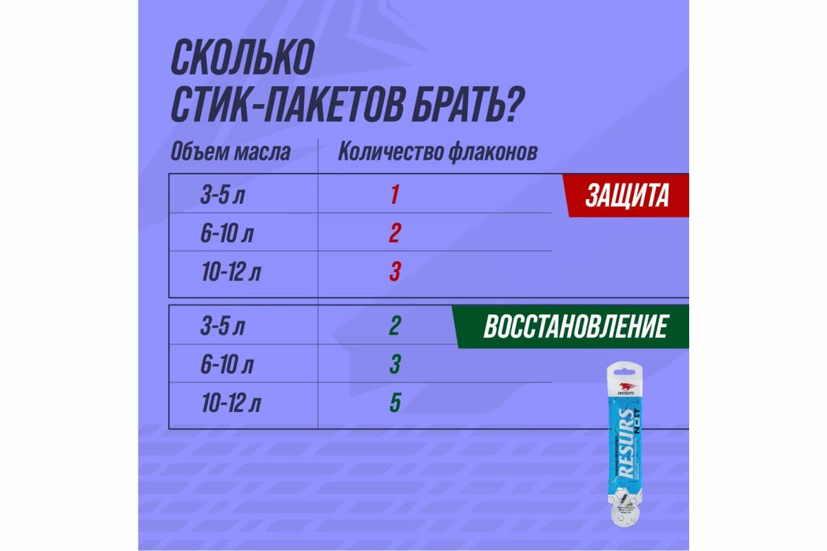 | Подробная комплектация | Присадка в масло ВМПАвто Resurs Next, 17 гр. - 3 шт. |