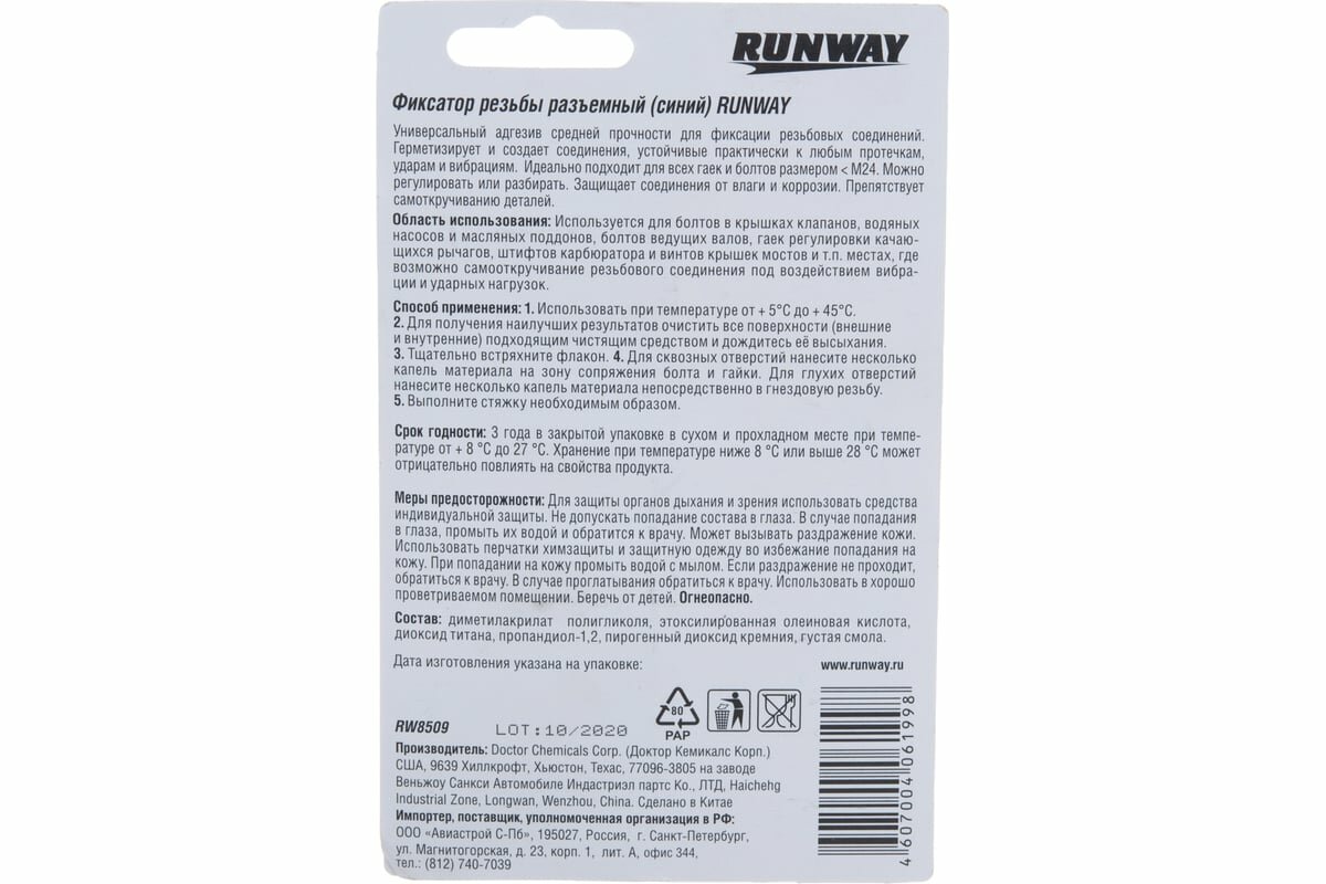 Фиксатор Резьбовых Соединений Съемный (Синий) RUNWAY арт. rw8509 интересное: