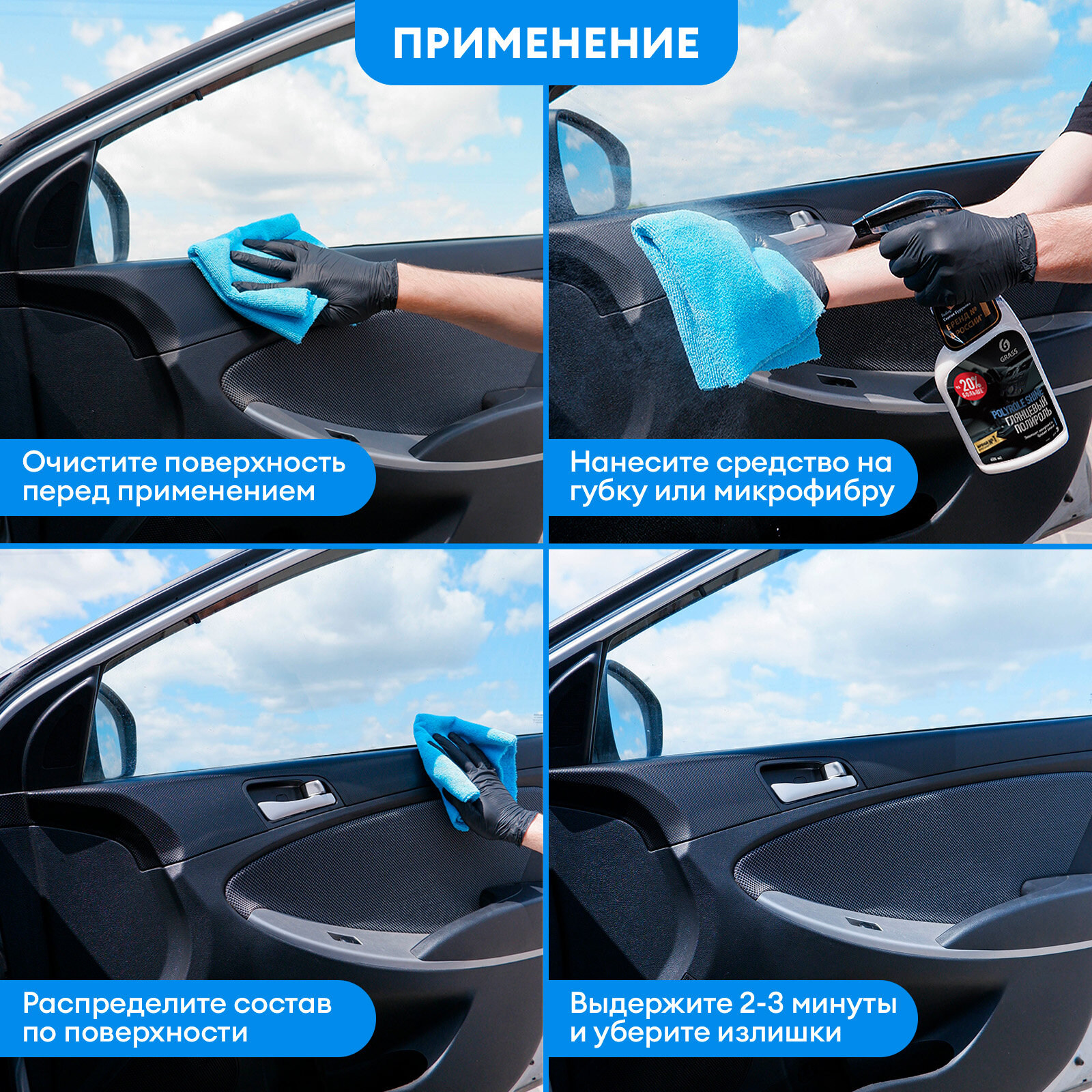 | Дополнительная информация | глянцевый полироль для кожи, резины и пластика "Polyrole Shine" 600 мл 1 шт., очиститель салона "Universal сleaner" 600 мл 1 шт., влажные салфетки 30 шт. 1 уп., салфетка из микрофибры размер 30 х 30 см 1 шт. |