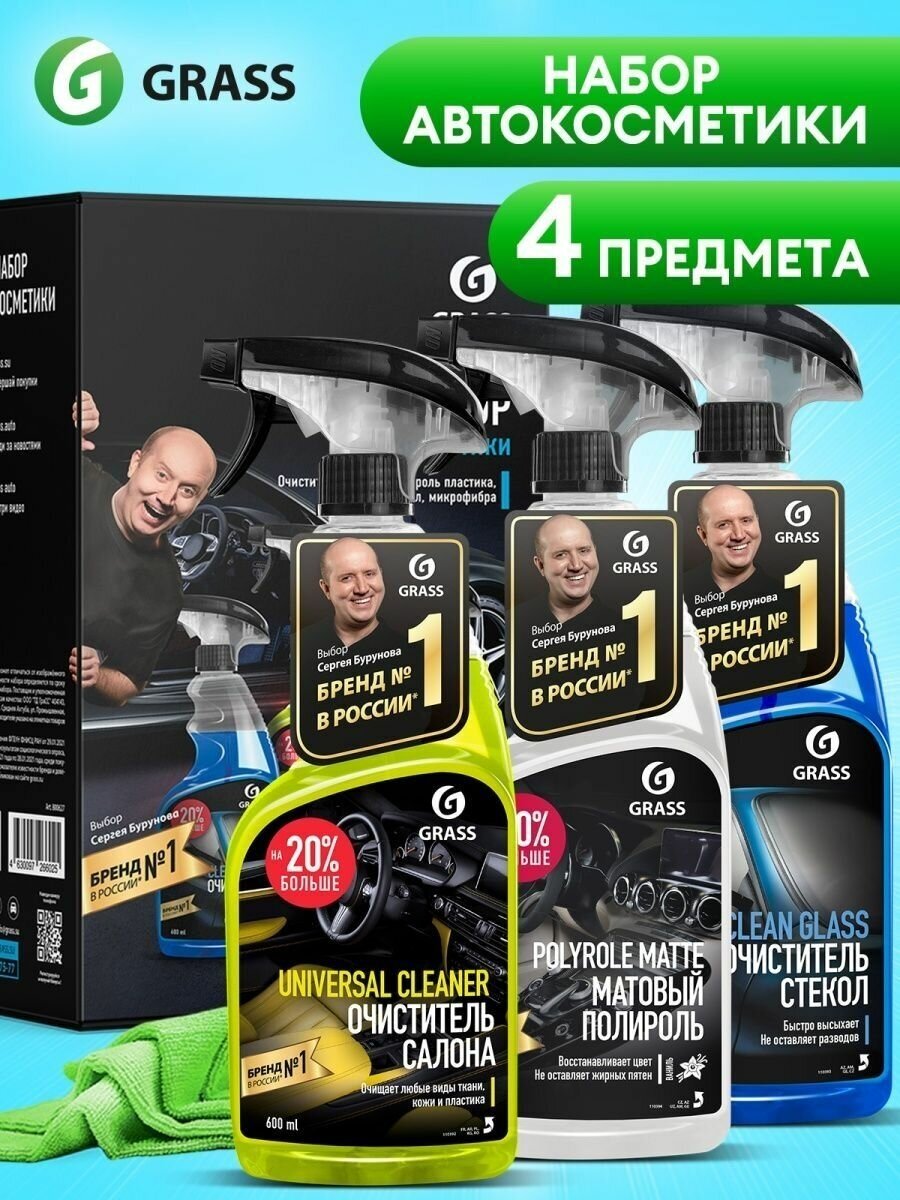 GRASS 800627 800627_набор автокосметики! 4 предмета (салфетка из микрофибры, очистители стекол, салона,пластика)\
