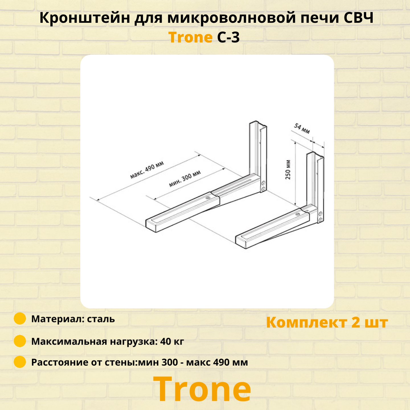 Кронштейн для СВЧ печи Trone С-3 настенный 490*300мм до 40кг - 2 шт. в упаковке - белый
