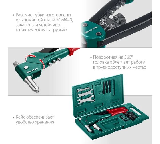 KRAFTOOL Combo3-M6, 360°, 3 вида заклёпок, комбинированный поворотный заклепочник в кейсе (31178)