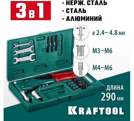 Комбинированный заклепочник KRAFTOOL Combo3-M6 поворотный 0-360гр. в кейсе 31178 интересное:
