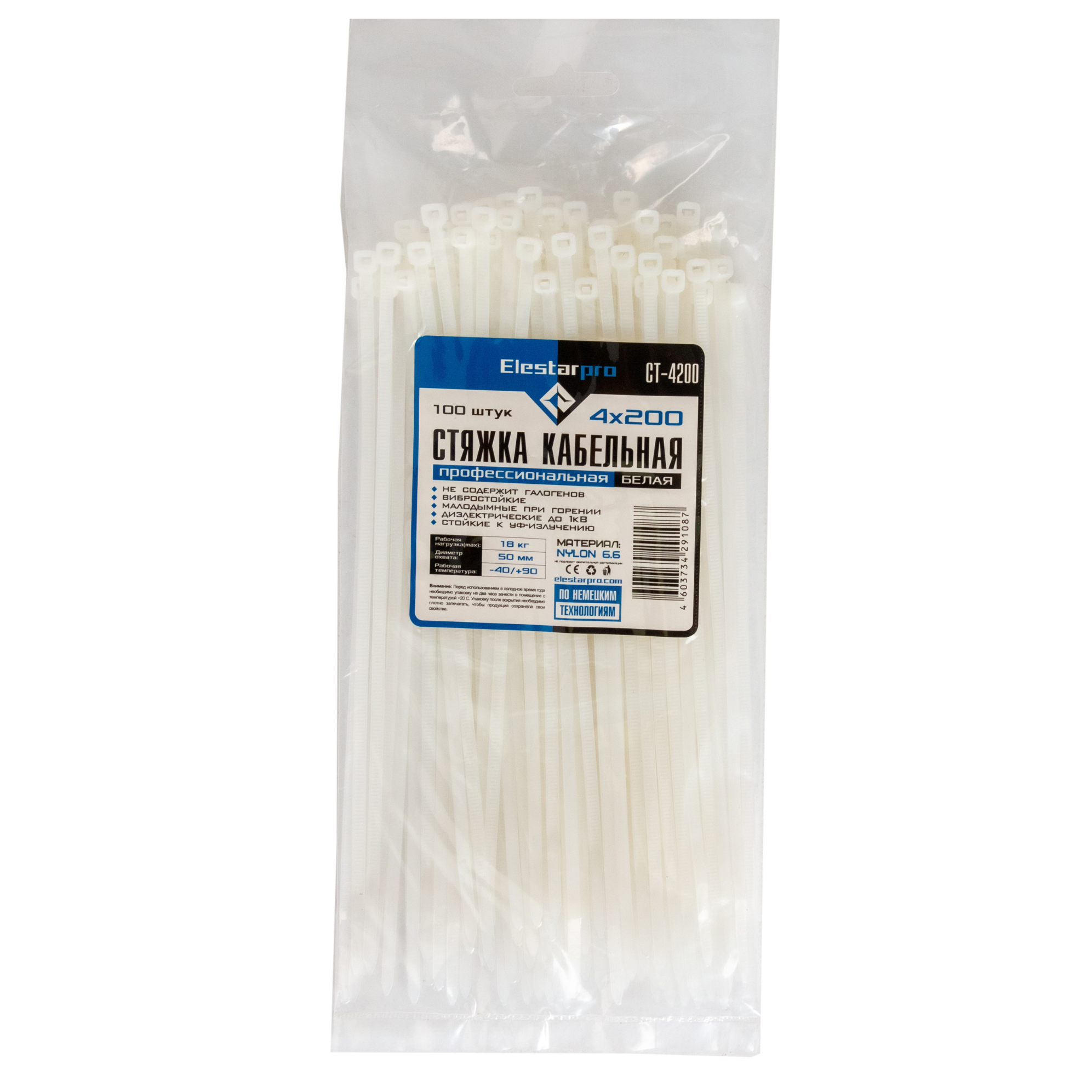 Стяжка (хомут) нейлоновая пластиковая ElestarPro 4x200мм, 100 штук в упаковке белая