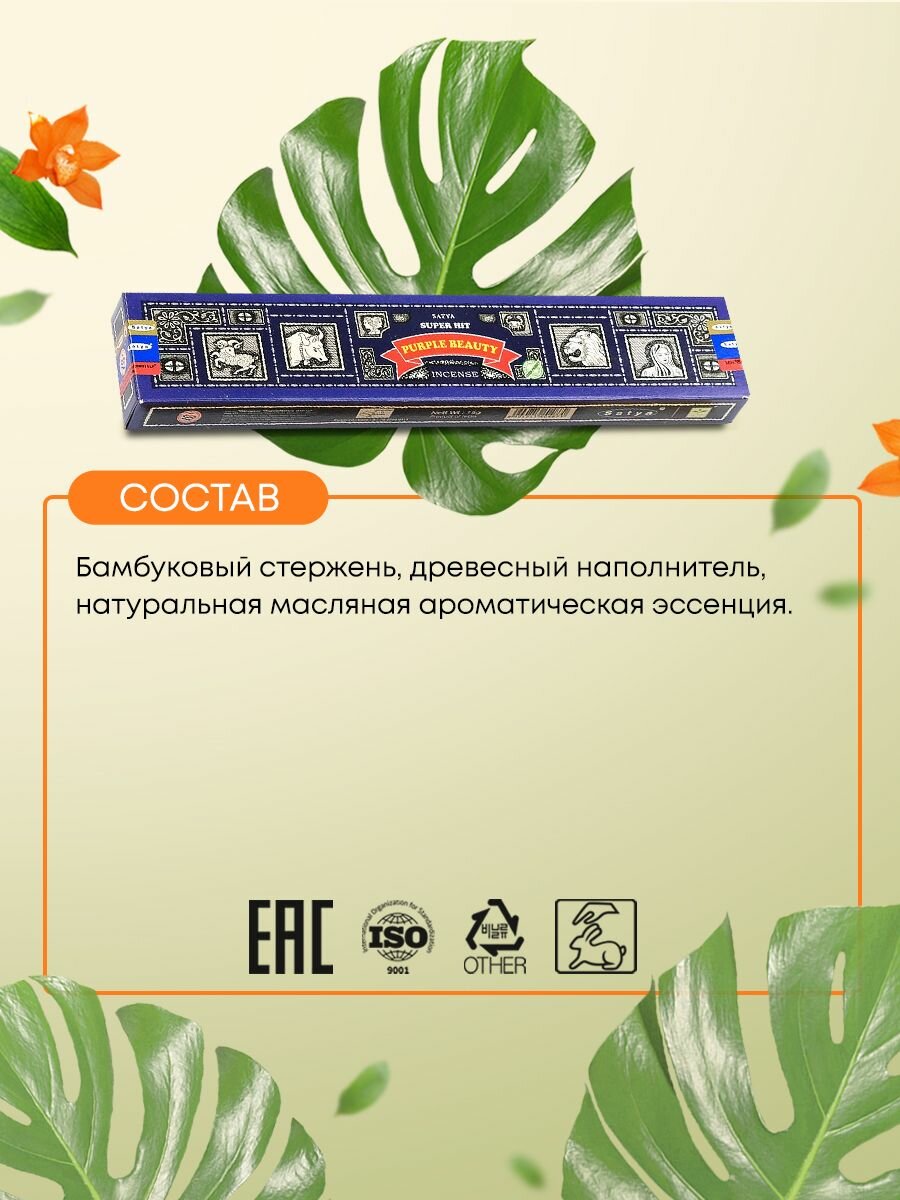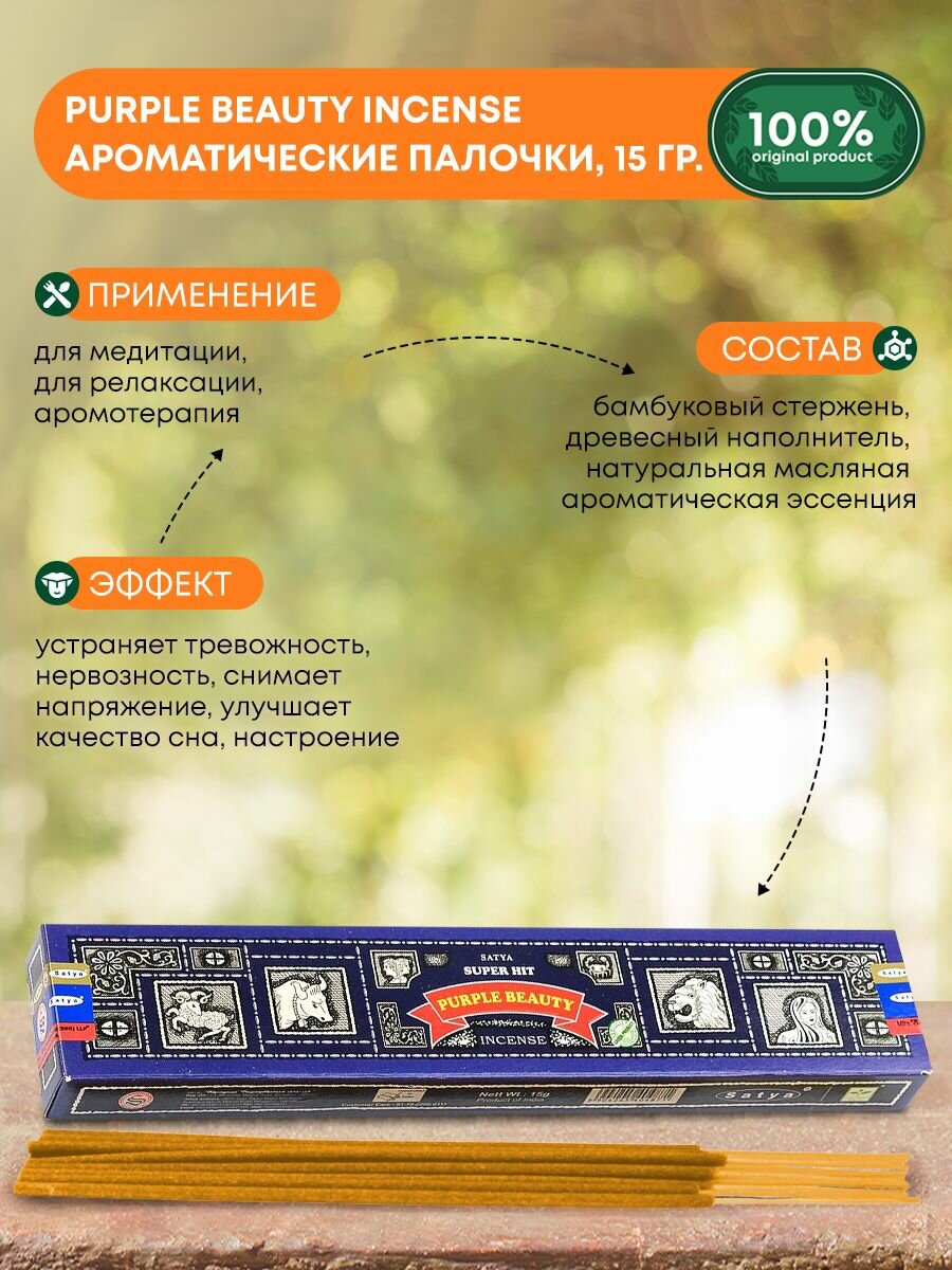 Купить Благовония Super Hit Purple Beauty Incense (Супер Хит Пурпурная красавица) Ароматические индийские палочки для дома, йоги и медитации, Satya (Сатья), 15г