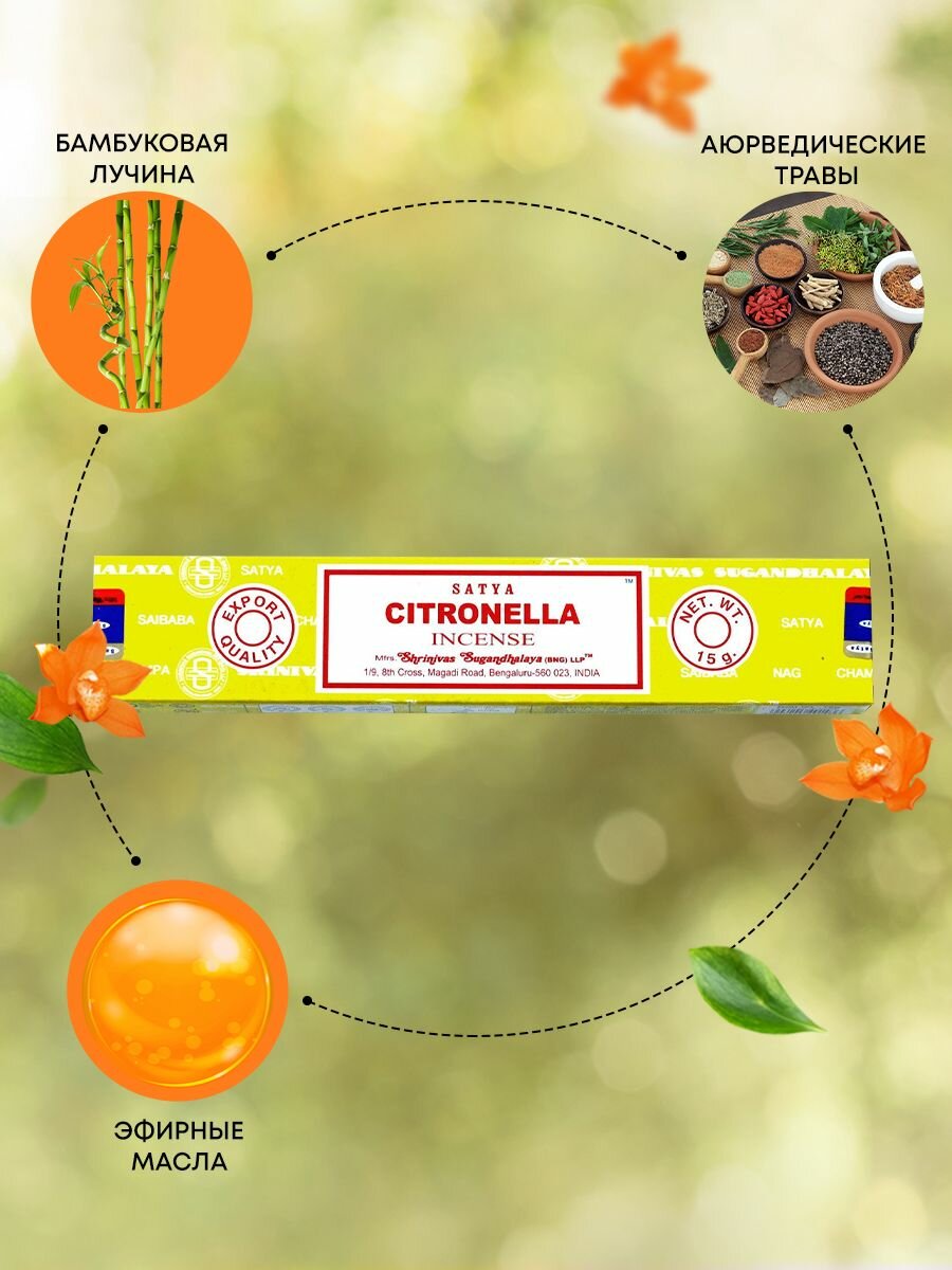 Купить Благовония Citronella Incense (Цитронелла) Ароматические индийские палочки для дома, йоги и медитации, Satya (Сатья), 15г
