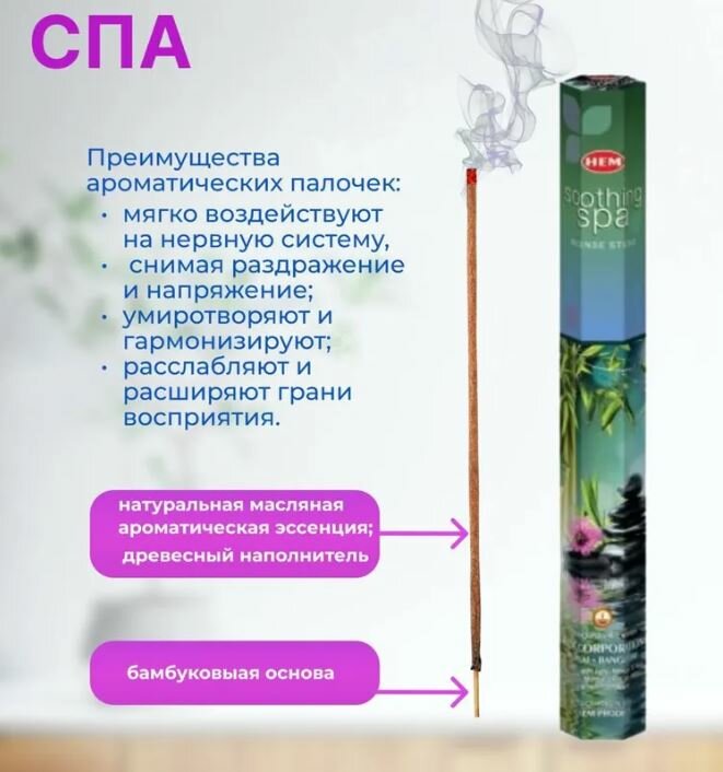 Благовония HEM Soothing Spa -Успокаивающий SPA, 20 палочек, аромат сладковато-пряных трав и индийских специй