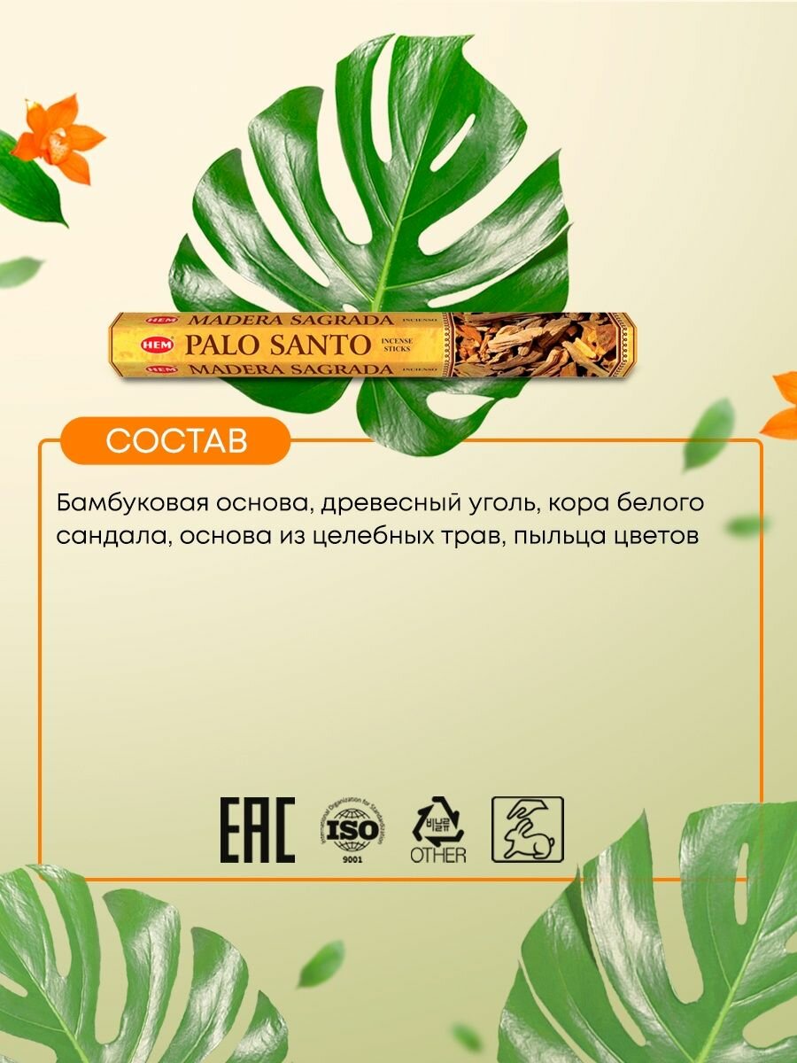 Натуральные индийские благовония HEM Священное дерево Пало Санто (Palo Santo), ароматические палочки 20 шт.