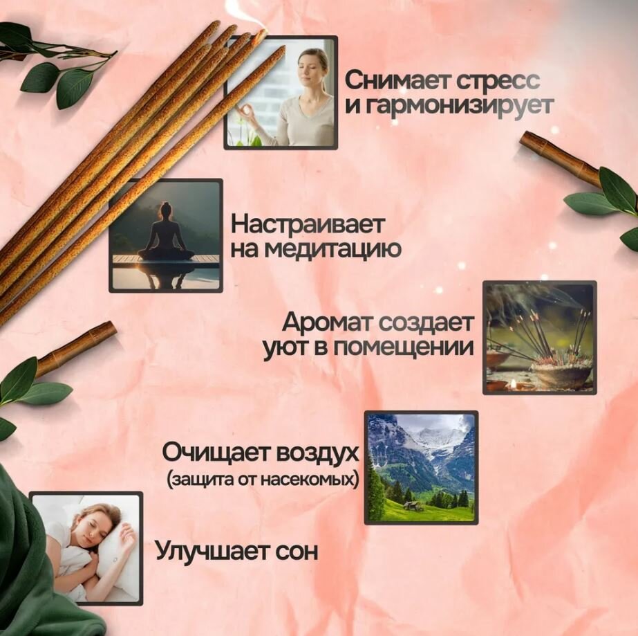 | Дополнительная информация | Способ применения: 1. Поднесите ароматическую палочку к источнику открытого огня. 2. Дождитесь воспламенения края палочки. 3. Погасите пламя ароматической палочки, воздействуя на неё интенсивными потоками воздуха. 4. Установите тлеющую аромапалочку в специальную подставку, или удерживайте её вертикально в руках. |