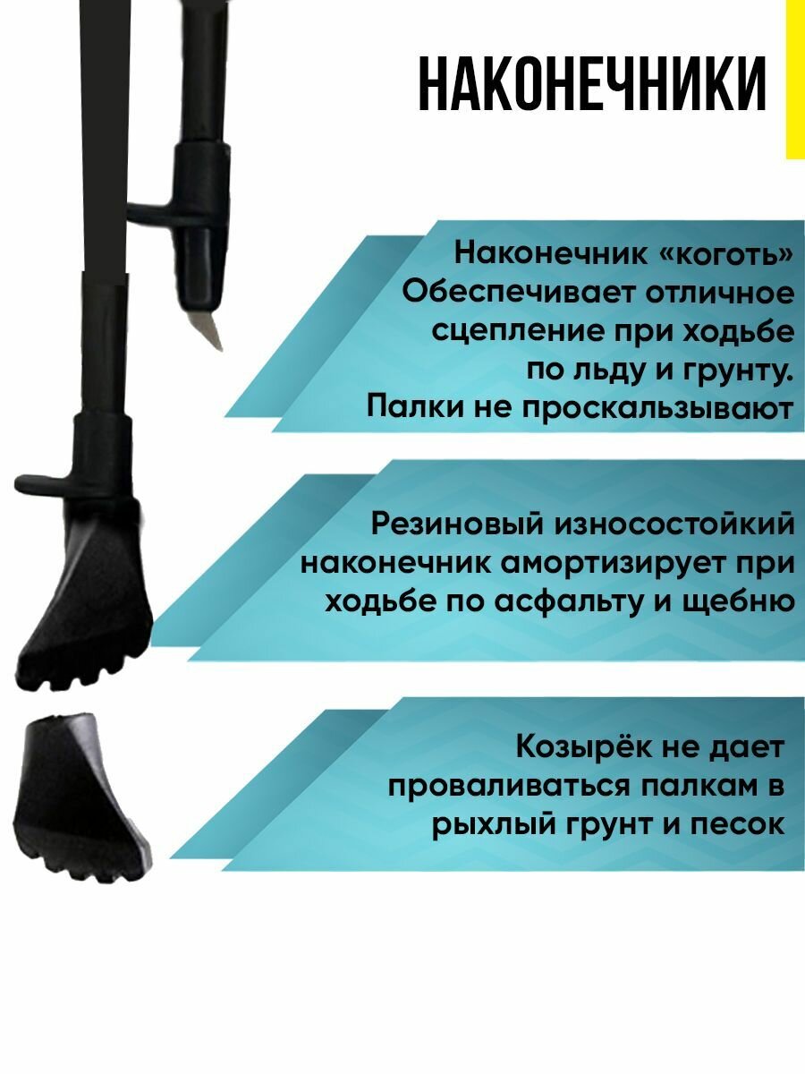| Дополнительная информация | Форма металлического наконечника: зубчатая для льда и снега, несъемный темляк-полуперчатка на липучке; использование: снег, асфальт, пересеченная местность; комплектация: Палки для скандинавской ходьбы - 2 шт. Съемный резиновый наконечник для асфальта - 2 шт. Несъемный металлический наконечник - 2 шт. Держатель для палок - 1 шт. Интегрированное кольцо для песчаного грунта - 2 шт. Не быстросъемные темляки-полуперчатки - 2 шт. Полиэтиленовая упаковка - 1 шт. Инструкция к палкам, по ходьбе и гарантия - 1 шт.; сезонность: лето, зима; диаметр кольца: 35 мм |
