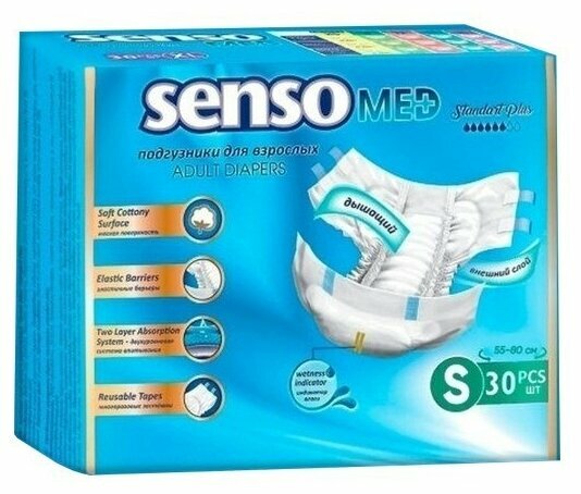 СохранитьПодгузники для взрослых Senso Med, размер S, 30 штук, 6 капель (55-80 см обхват талии) интересное: