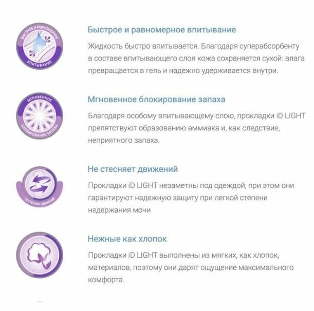 | Дополнительная информация | Прокладки iD Light Mini не стесняют движений, что позволяет вести активный образ жизни, как обычно. |