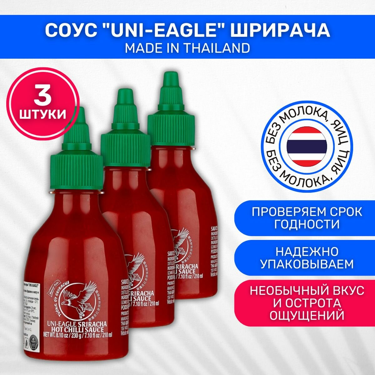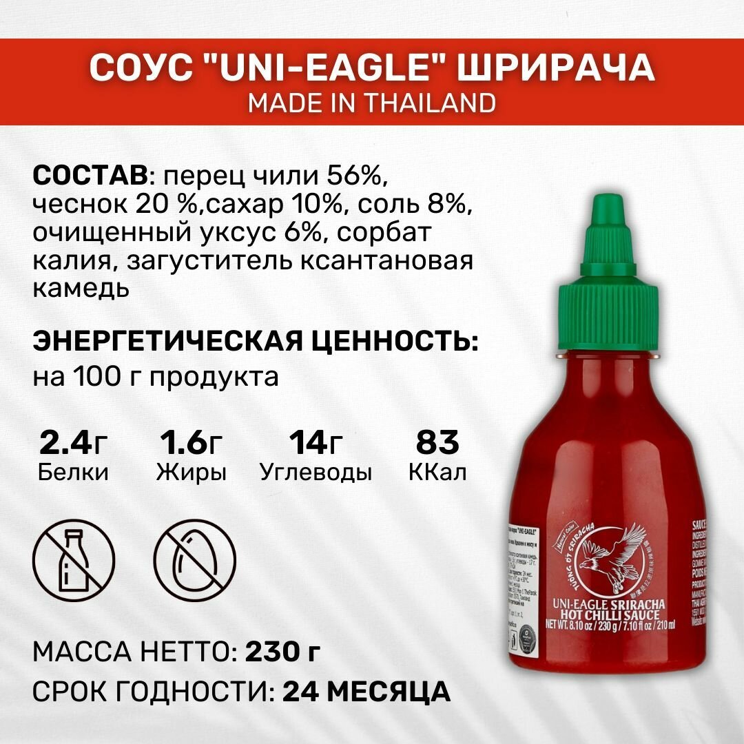 Ниже Вы можете прочитать отзывы на Соус Uni-Eagle Шрирача, 3 шт. по 230 г, ознакомится с подробными характеристиками, посмотреть интересные обзоры и фотографии на Соус Uni-Eagle Шрирача, 3 шт. по 230 г.