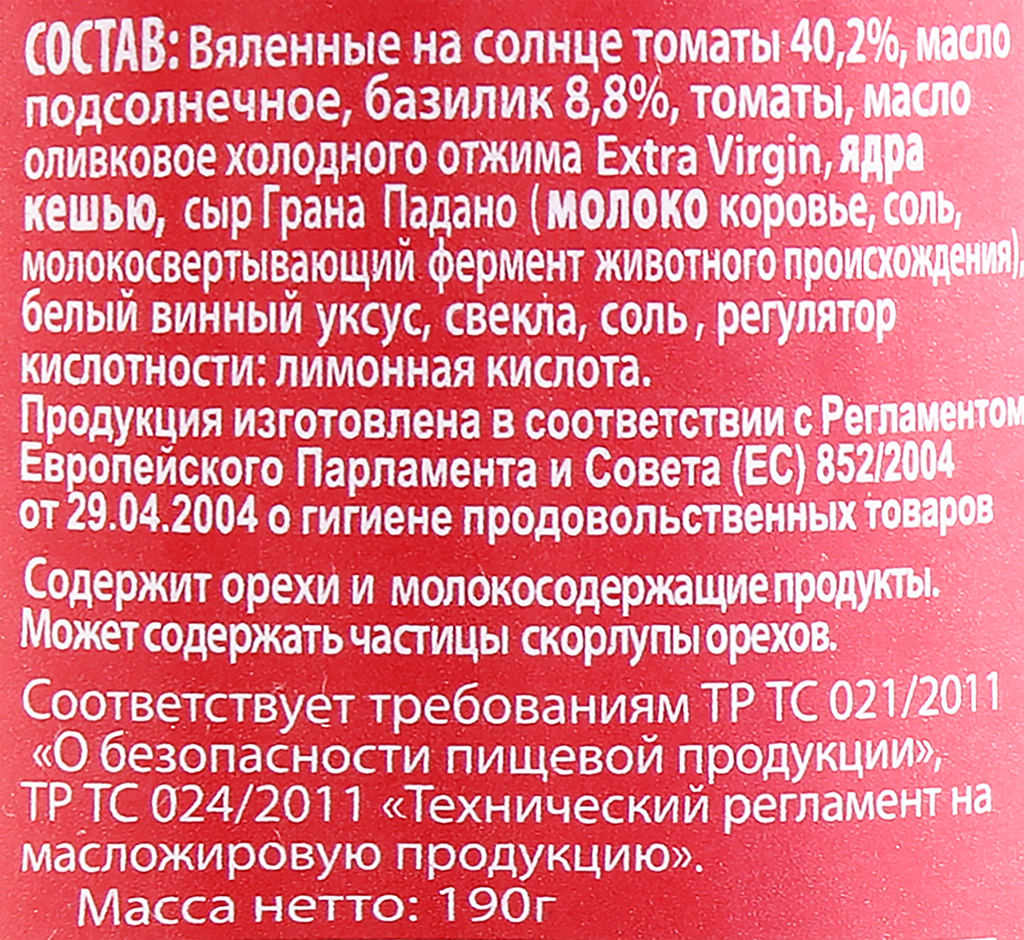 | Состав | вяленные на солнце томаты 40,2%, масло подсолнечное, базилик 8,8%, томаты, масло оливковое холодного отжима extra virgin, ядра кешью, сыр грана падано (молоко коровье, соль, молокосвертывающий уксус), свекла, соль, регулятор кислотности: лимонная кислота |