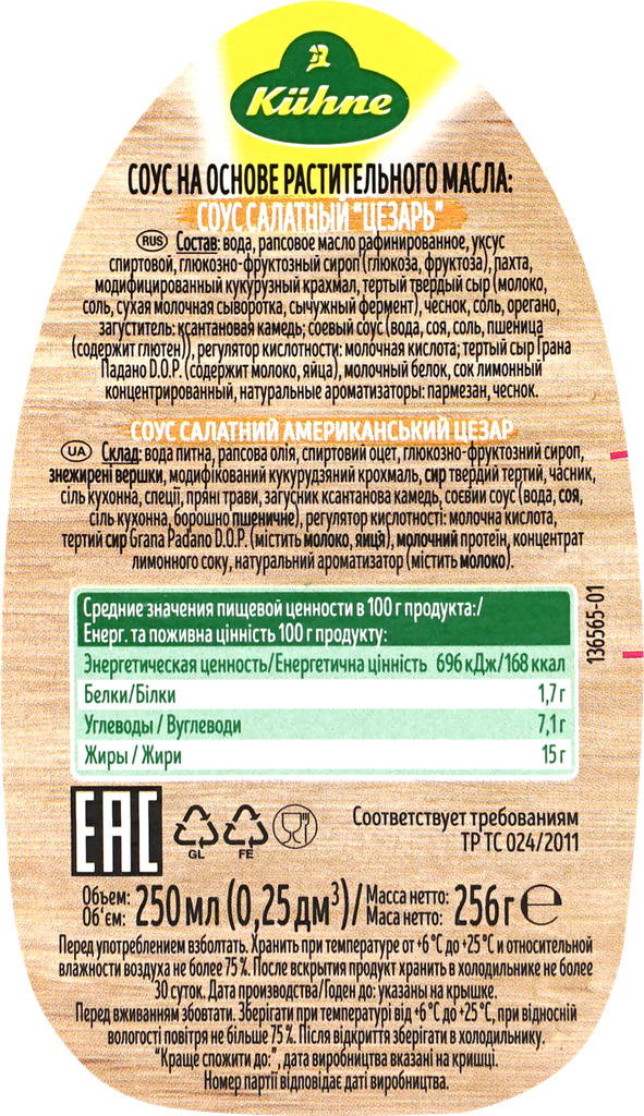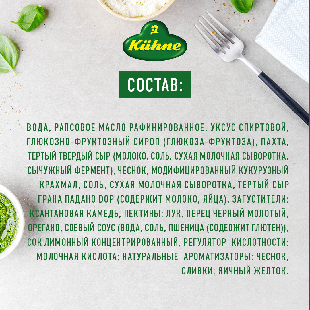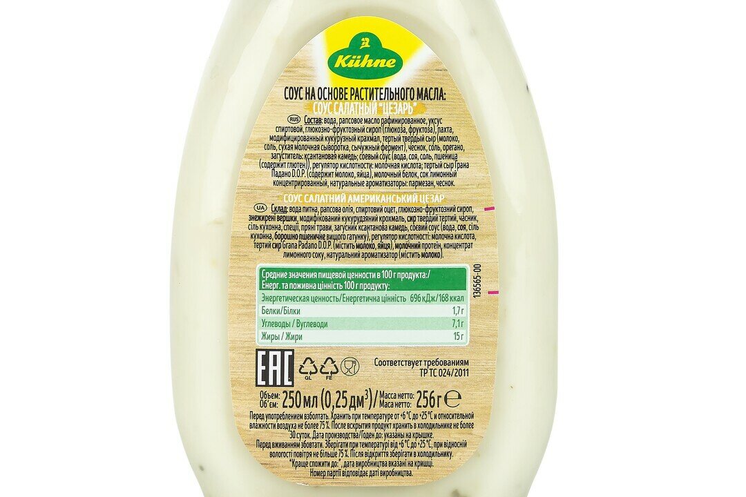 | Состав | вода, рапсовое масло, спиртовой уксус, глюкозно-фруктозный сироп, пахта, тертый твердый сыр, чеснок, соль, модифицированный кукурузный крахмал, яичный желток, молочная сыворотка, загустители (ксантановая камедь, пектин), специи (чеснок, перец, орегано), соевый соус (вода, соя, пшеница, соль), концентрированный лимонный сок, регулятор кислотности: молочная кислота, натуральные ароматизаторы: чеснок, молоко |