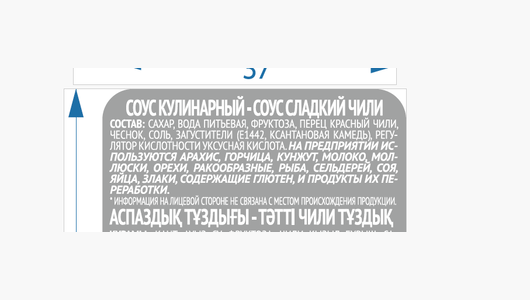 | Состав | сахар, вода питьевая, фруктоза, перец красный чили, чеснок, соль, загустители (Е1442, ксантановая камедь), регулятор кислотности уксусная кислота. На предприятии используются арахис, горчица, кунжут, молоко, моллюски, орехи, ракообразные, рыба, сельдерей, соя, яйца, злаки, содержащие глютен, и продукты их переработки |