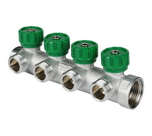 Коллектор FAR 1"х3/4" 4 выхода под плоскую прокладку хромированный с вентилями