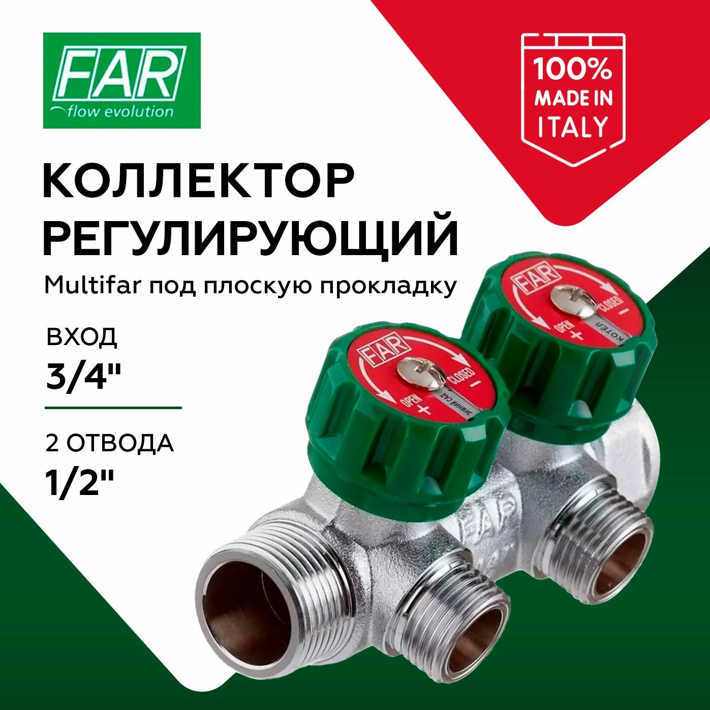 Коллектор FAR 3/4"х1/2" 4 выхода под плоскую прокладку хромированный с вентилями