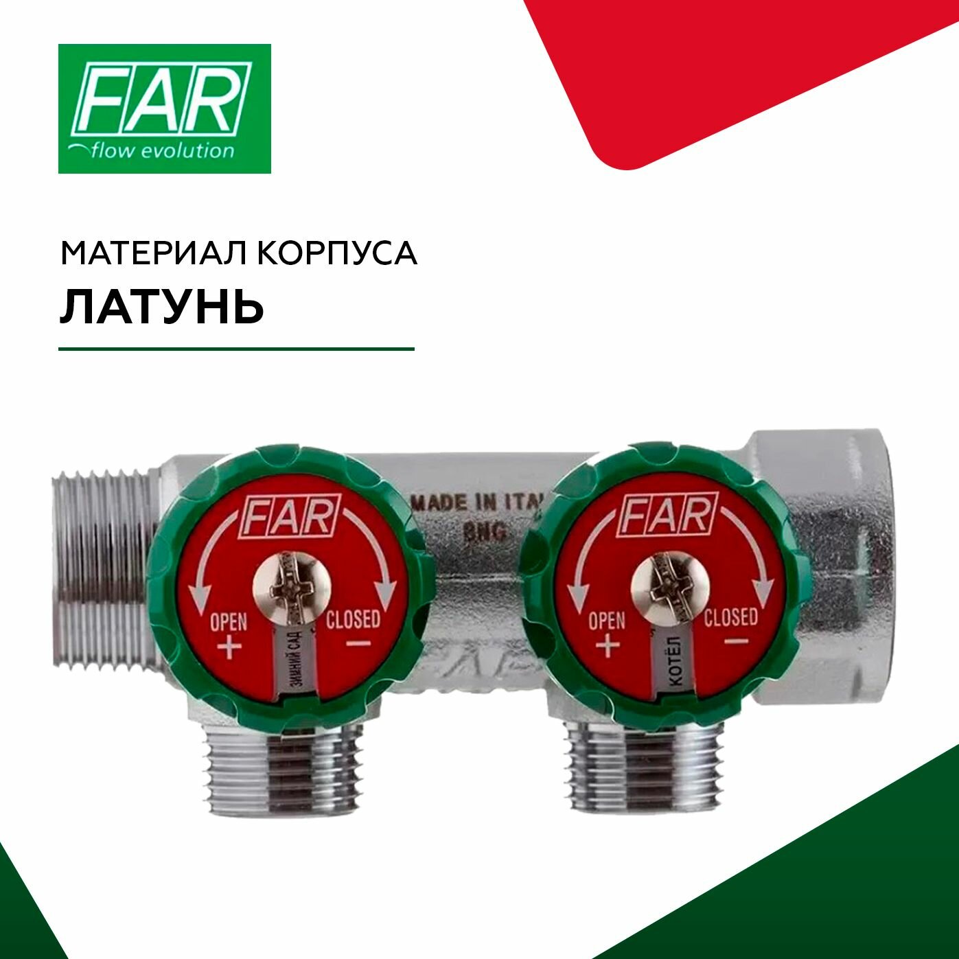 Коллектор FAR 1"х1/2" 4 выхода под плоскую прокладку хромированный с вентилями