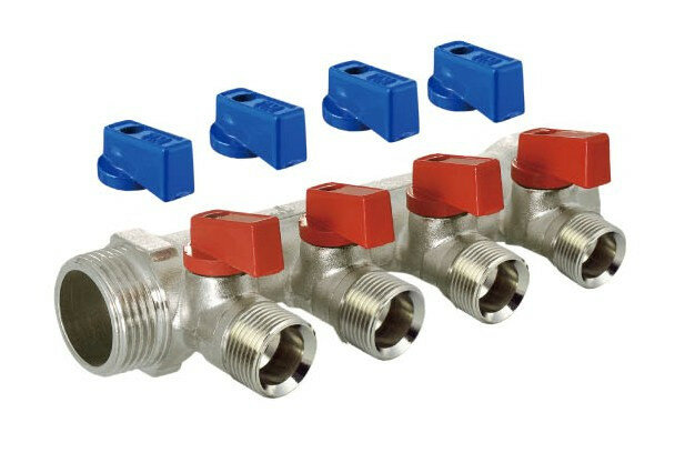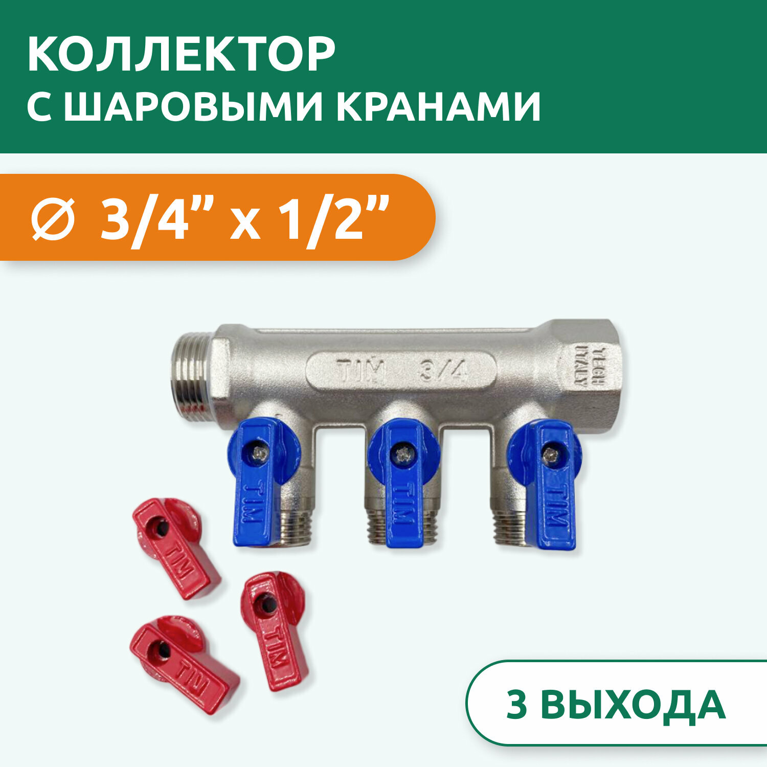 Коллектор с шаровыми кранами 3/4", 3 отвода 1/2" (красные и синие ручки) TIM MV-3/4-N-3