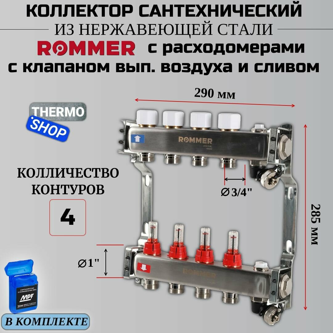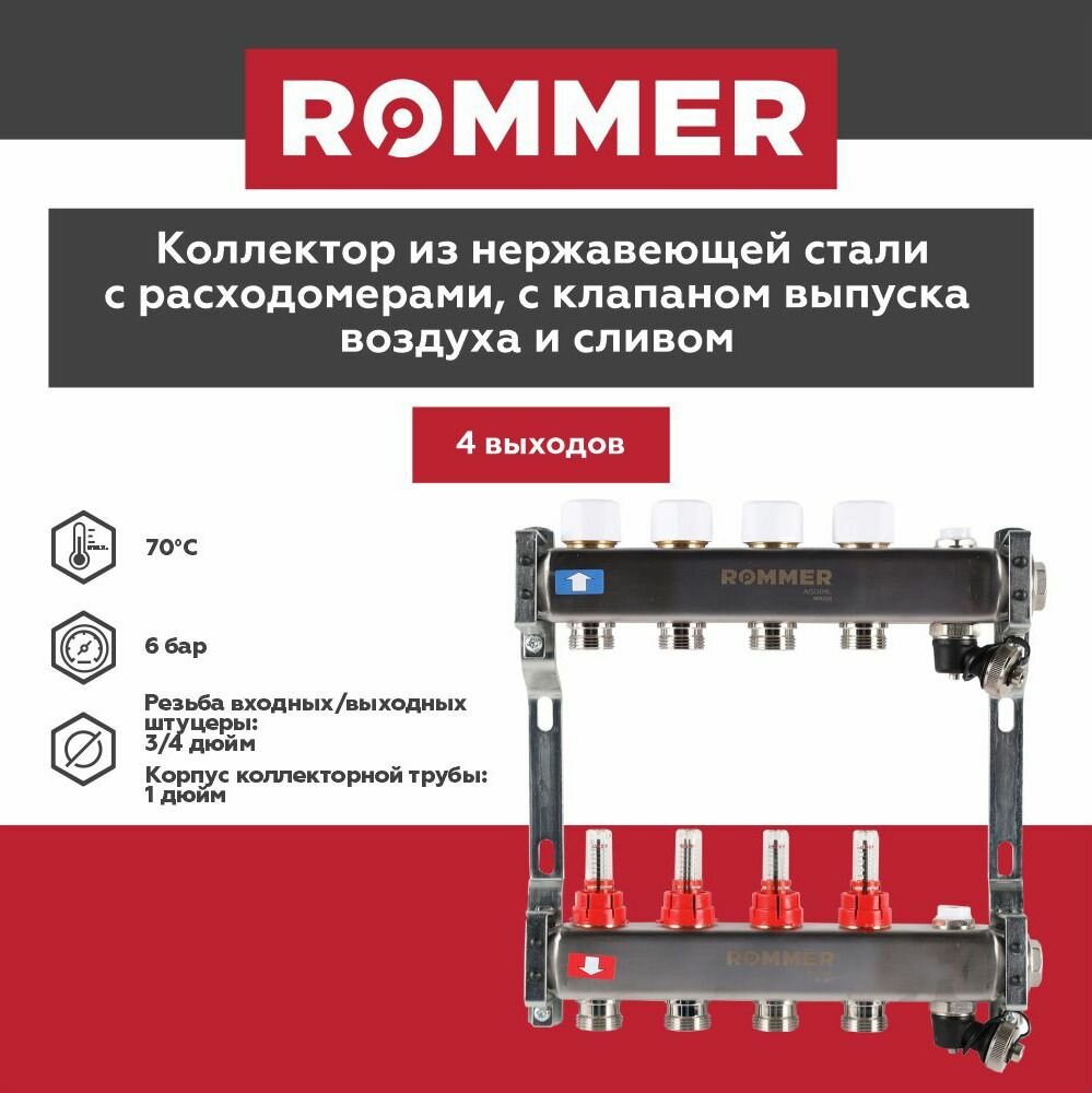 Купить Коллектор Rommer с расходомерами, с клапаном вып. воздуха и сливом 4 вых.