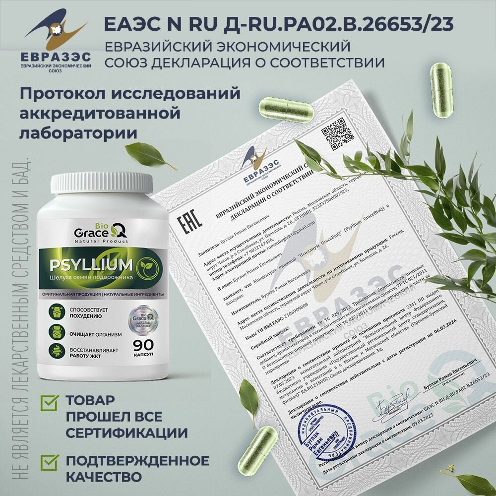 Псиллиум GraceBioQ в капсулах, шелуха подорожника, клетчатка для похудения, детокса, от запоров 90 капсул.