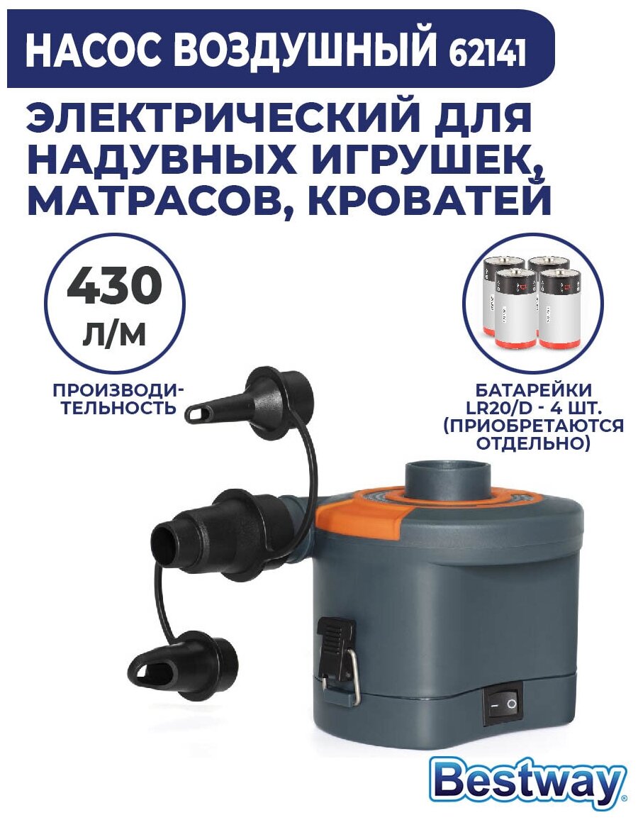 Насос воздушный электрический, 3 насадки, на батарейках, 430 л/м, Bestway, Sidewinder D Cell, 62141 интересное: