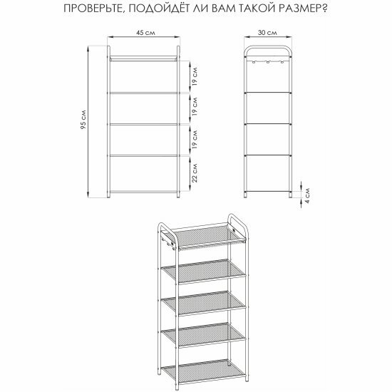 | Дополнительная информация | Наклонная полка; бортики на полках защитят стену; через мелкую сетку не провалится каблук |