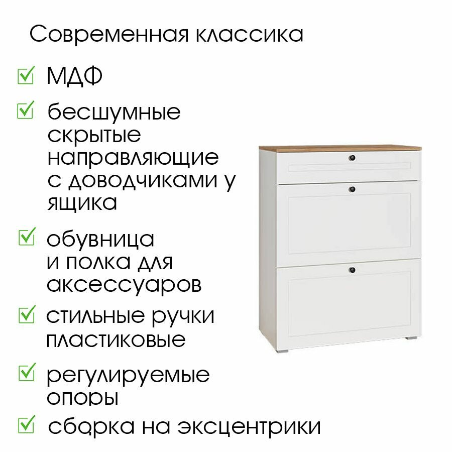 | Дополнительная информация | ящик для хранения с бесшумными направляющими скрытого монтажа с доводчиками, ниже 2 откидных фасада на четырехшарнирных петлях и барных кронштейнах (за верхним фасадом расположена полка для обувных аксессуаров), матовые металлические ручки - долгосрочность использования, пластиковые регулируемые опоры - простота регулировки при неровностях пола, надежная фурнитура - гарантия длительной эксплуатации, корпус ЛДСП 1,6 см, фасады МДФ 1,9 см, кромка ПВХ 0,4 и 2,0 мм, максимальная нагрузка на столешницу до 10 кг, максимальная нагрузка на ящик для хранения до 3 кг, максимальная нагрузка на каждую обувницу до 3 кг, во избежание опрокидывания и травмобезопасности предусмотрено крепление к стене (в комплекте) |