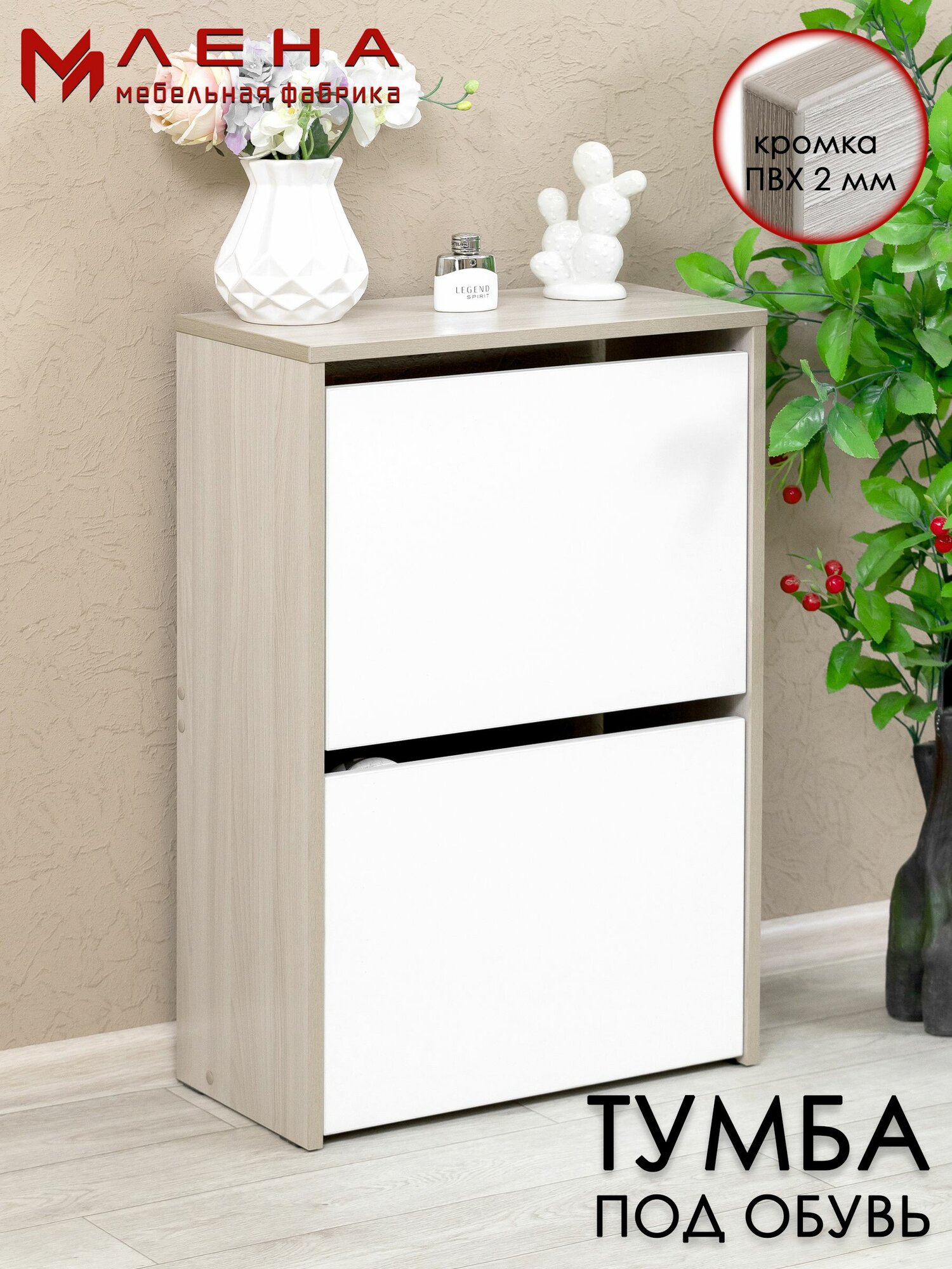 Обувница с откидными дверцами, тумба для обуви в цвете ясень шимо светлый. Мебельная фабрика лена