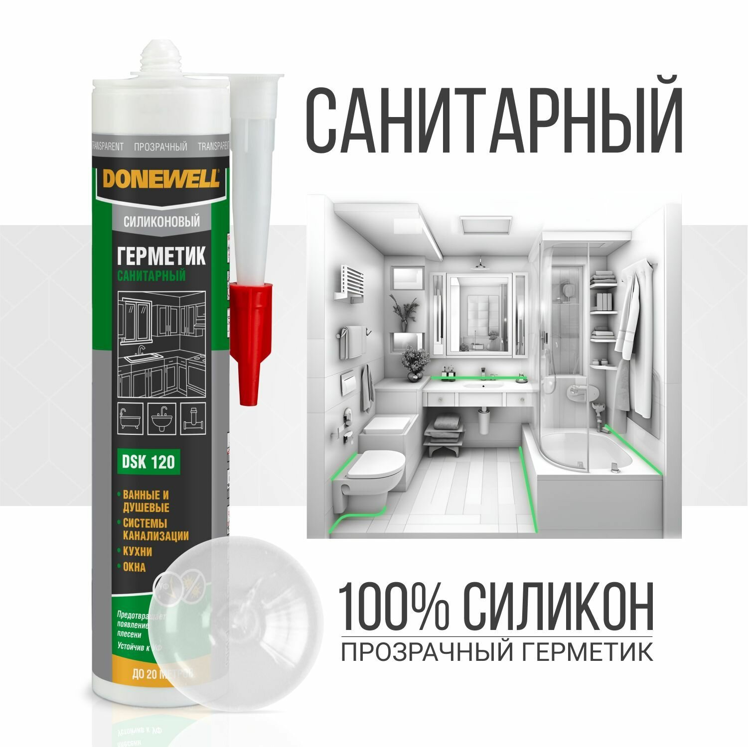 Герметик силиконовый DONEWELL санитарный DST-120, для ванной и кухни, с добавкой против плесени, прозрачный, 40 мл