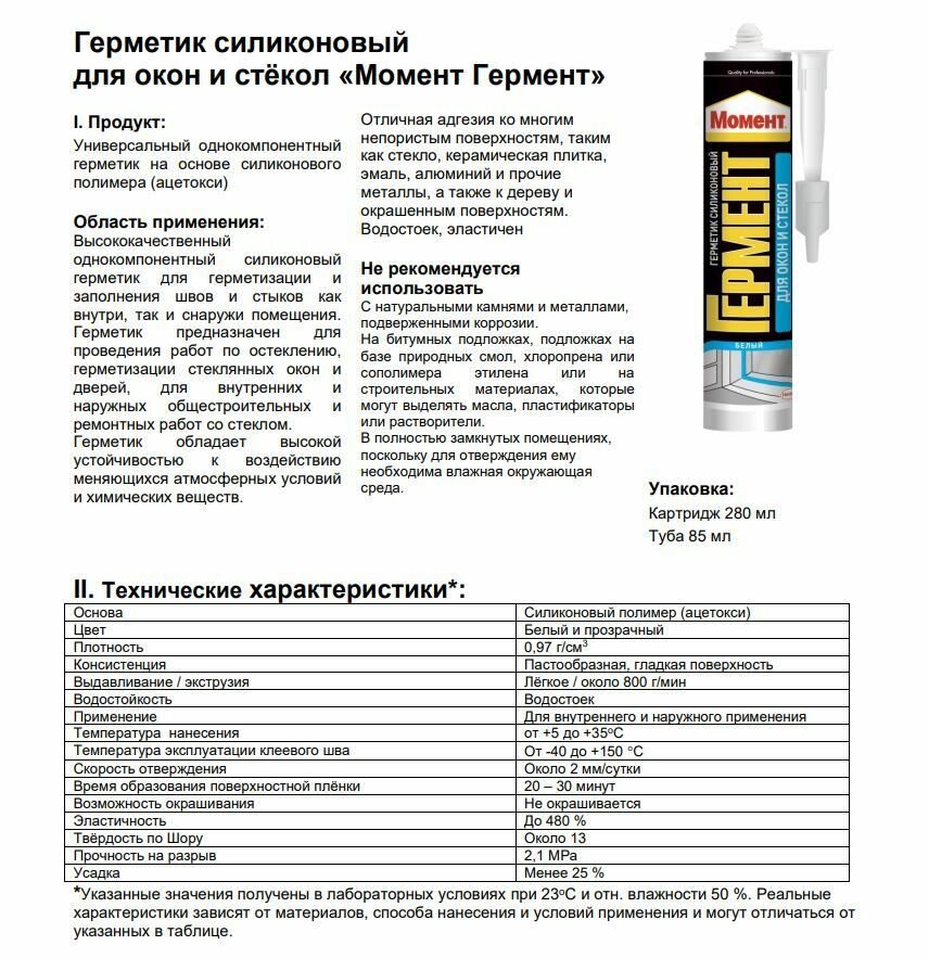 | Дополнительная информация | Не следует использовать: для герметизации аквариумов; для герметизации швов в плавательных бассейнах; на поверхностях, контактирующих с пищевыми продуктами; для зеркал. |
