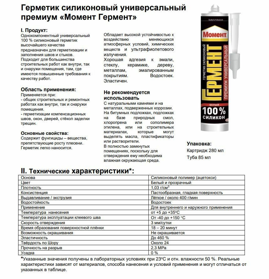 | Дополнительная информация | Не следует использовать: для герметизации аквариумов; для герметизации швов в плавательных бассейнах; на поверхностях, контактирующих с пищевыми продуктами; для зеркал. |